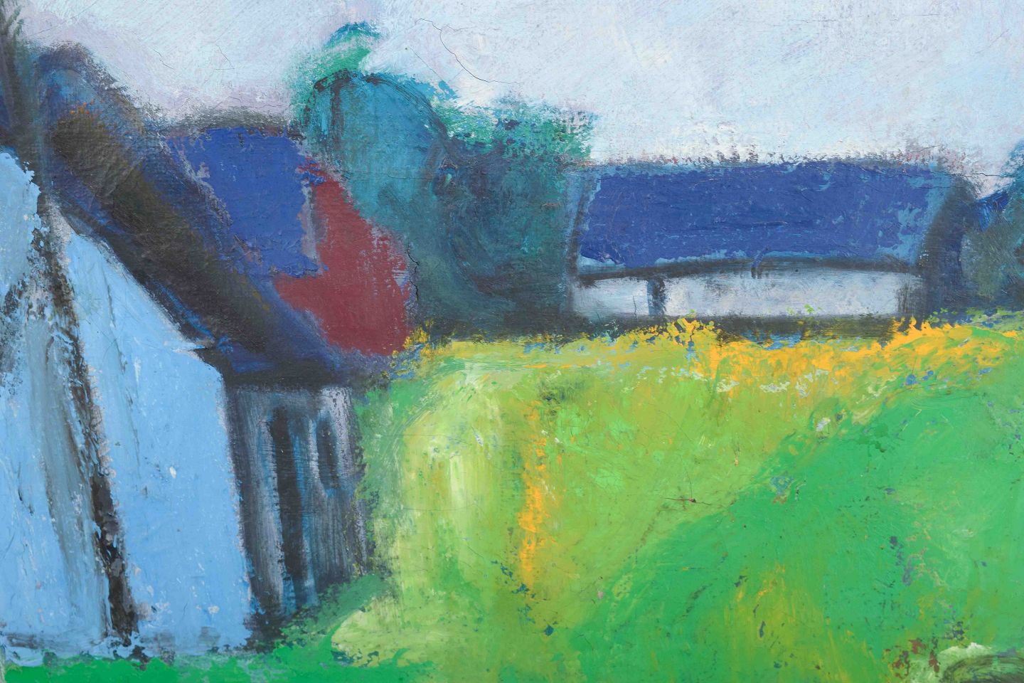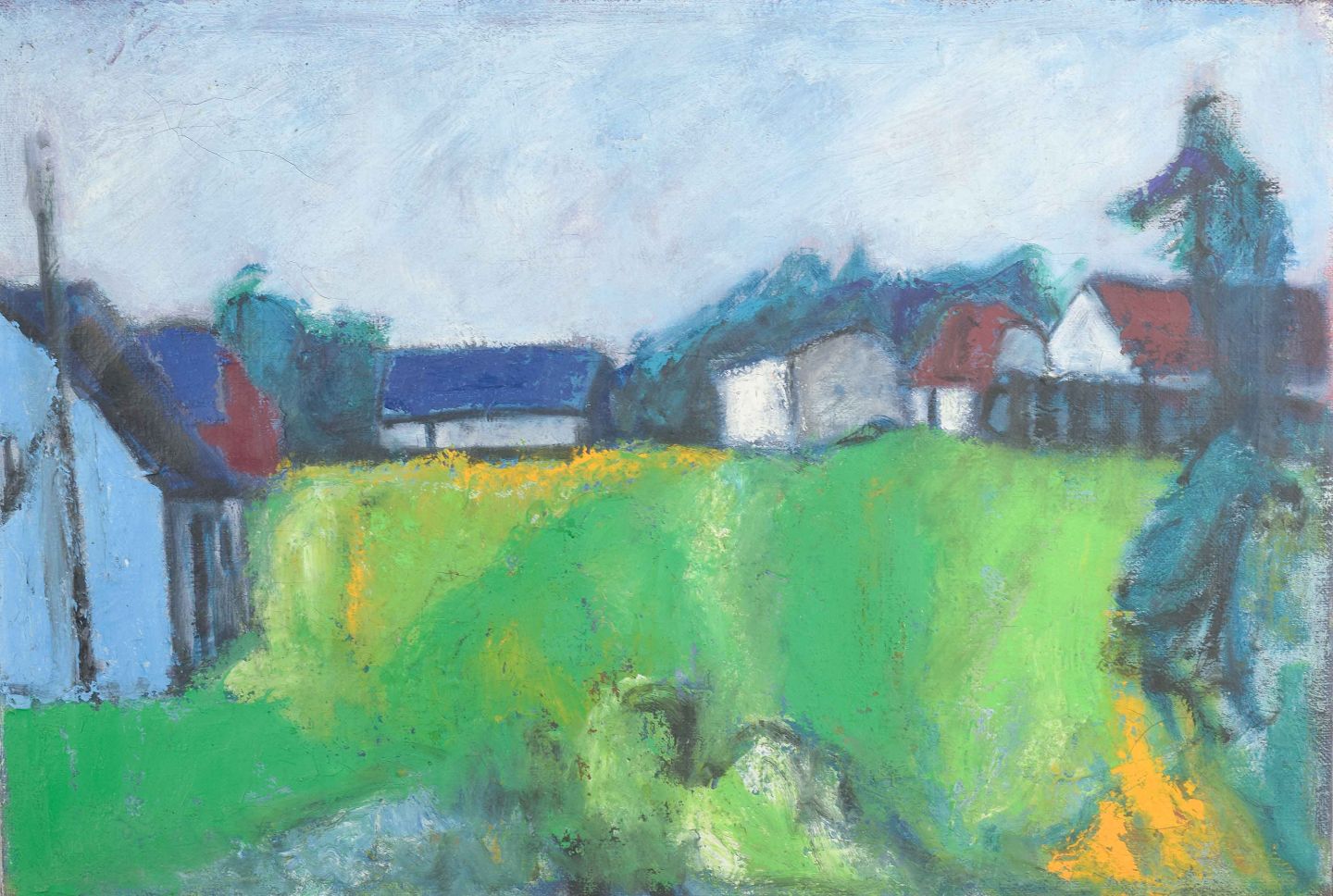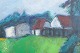 An atmospheric and expressive landscape painting with houses in the background, where strong green and blue hues dominate the composition. The brushstrokes are free and spontaneous, giving the work intensity and a vivid atmosphere, characteristic of Madsen’s painterly style.