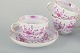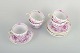 Porcelæns tesæt bestående af fem kopper med underkopper, håndmalet i det klassiske mønster "Pink Indian". Dekoreret med rosa blomster og blade samt guldbemaling på kanter og hanke.