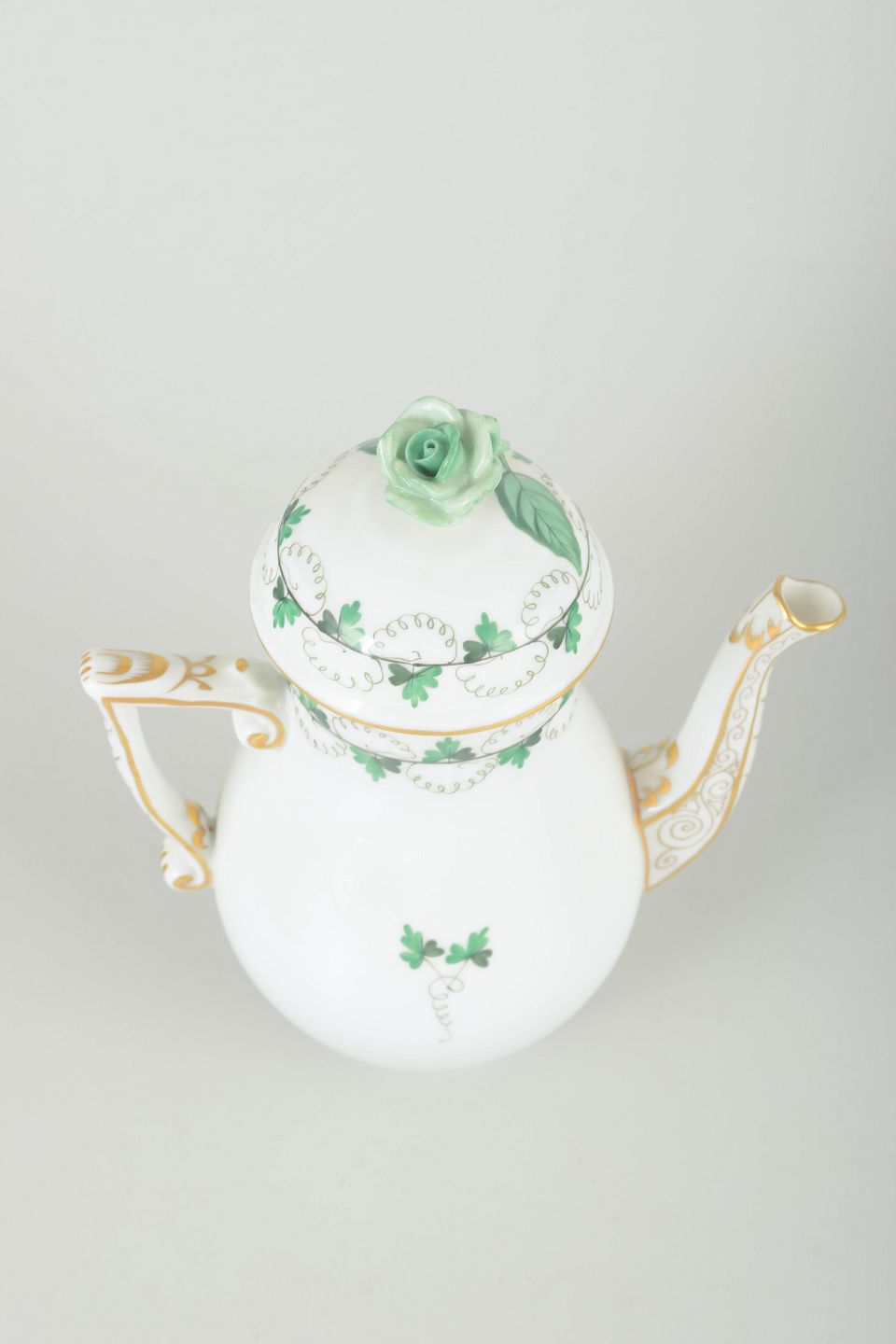 Elegant porcelænskande med håndmalet grønt bladdekor og forgyldte detaljer. Låget afsluttes med knop i form af en grøn porcelænsrose. Klassisk svungen form med dekorativ hank og tud.