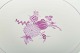 Håndmalet rund skål i porcelæn med dekor i lilla blomsterkompositioner og let bølget kant. Klassisk Meissen-design med elegant staffering i rosa toner.
