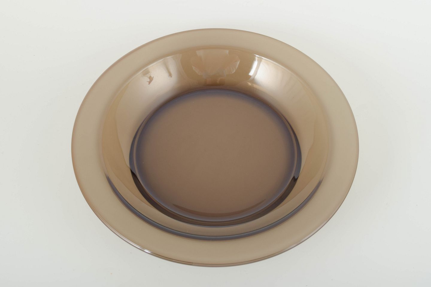Decorative smoked glass bowl with a rounded form and wide rim. A classic example of French household design by Arcoroc, known for its durable and timeless glassware used in both professional and domestic settings.