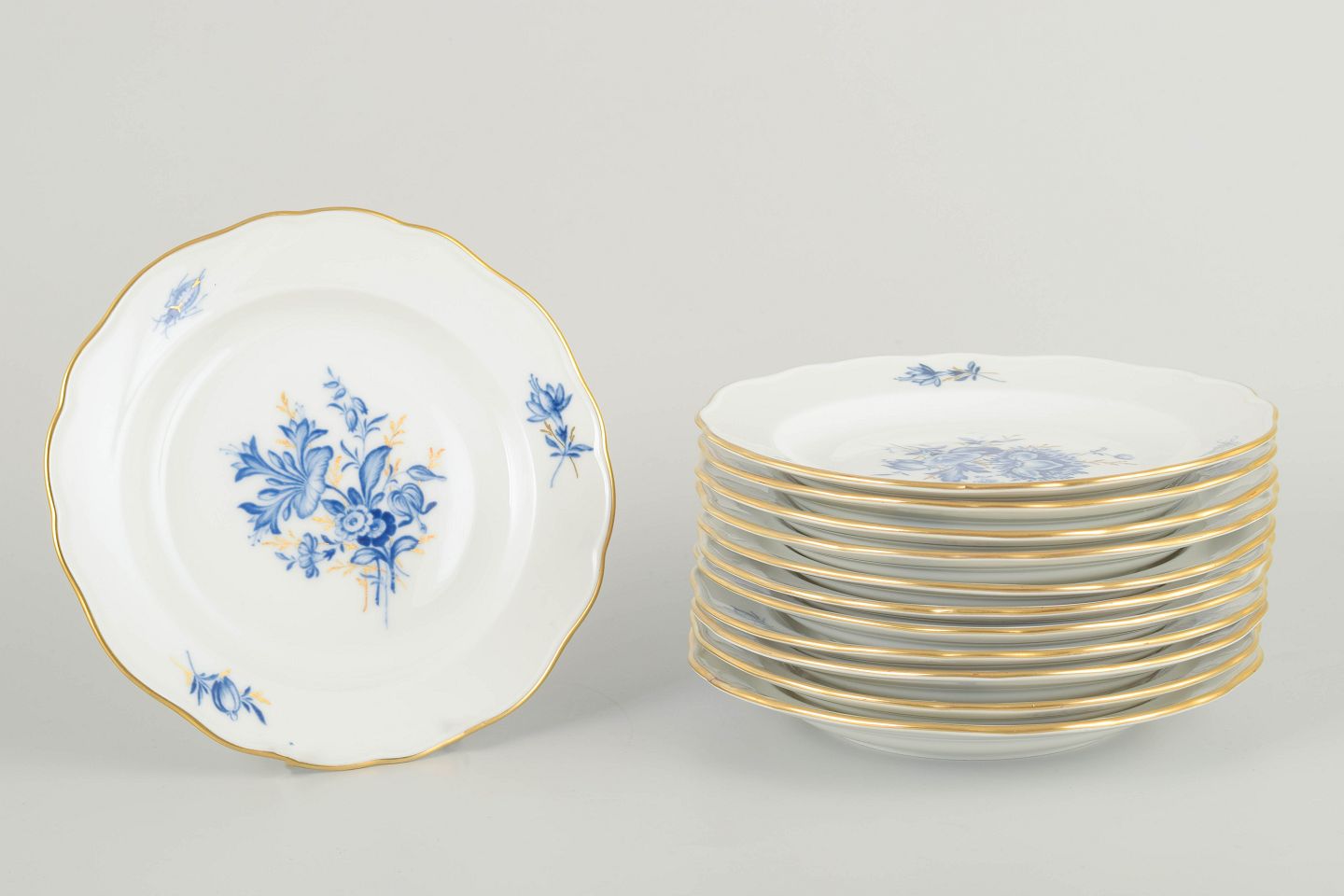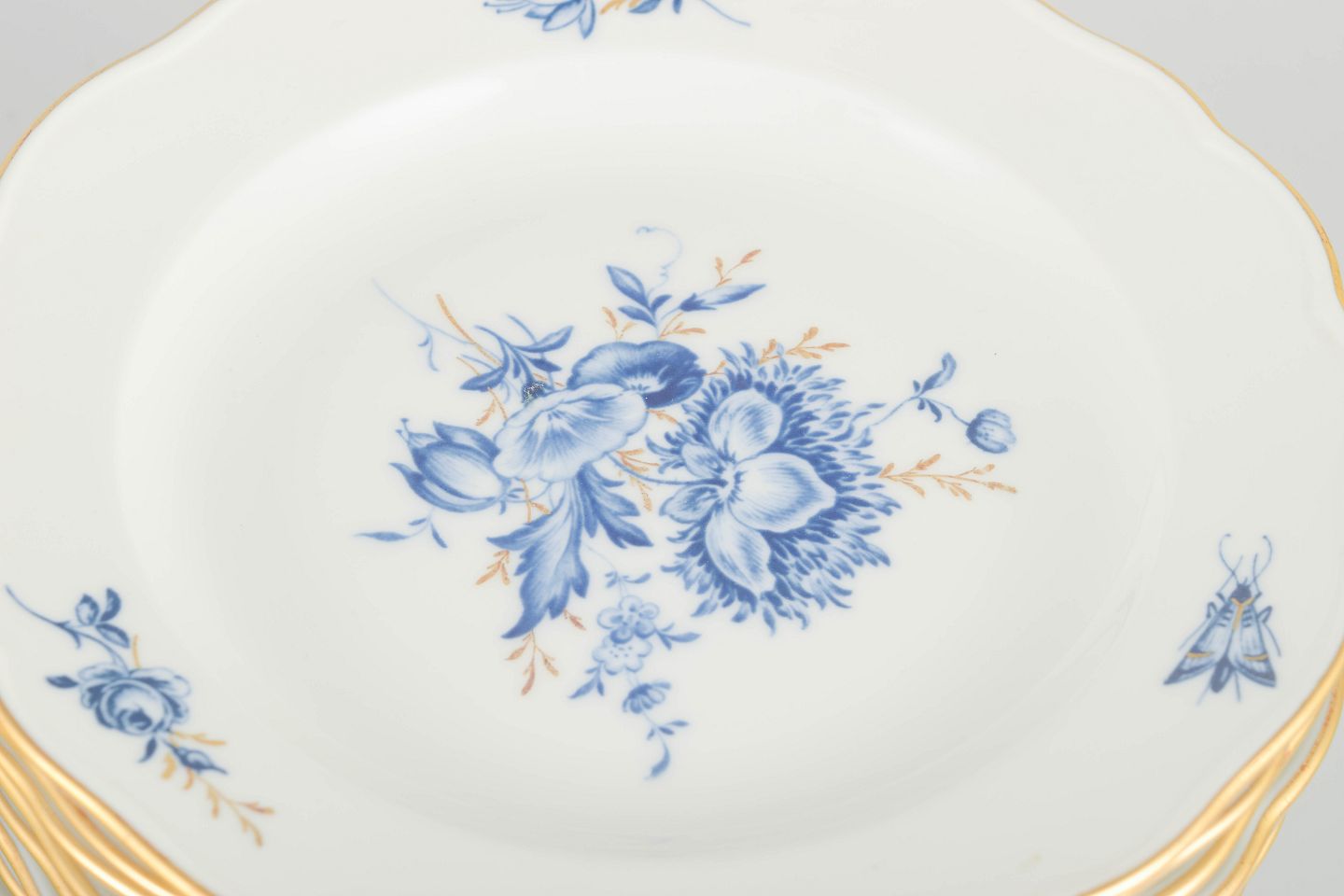 Hånddekoreret porcelæn med håndmalede blå blomsterdekorationer og forgyldte stafferinger langs kanten. Klassisk let bølget form.