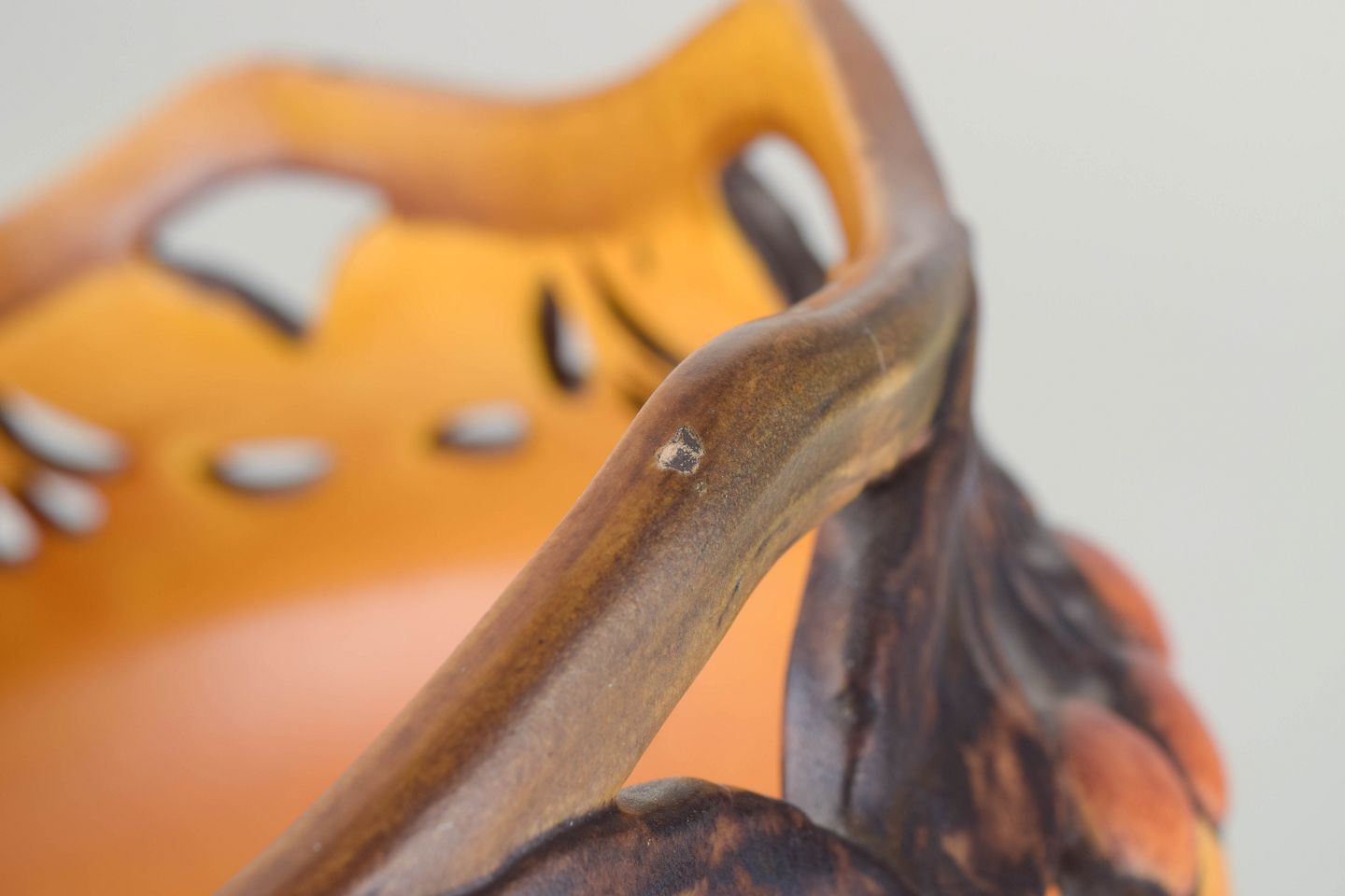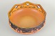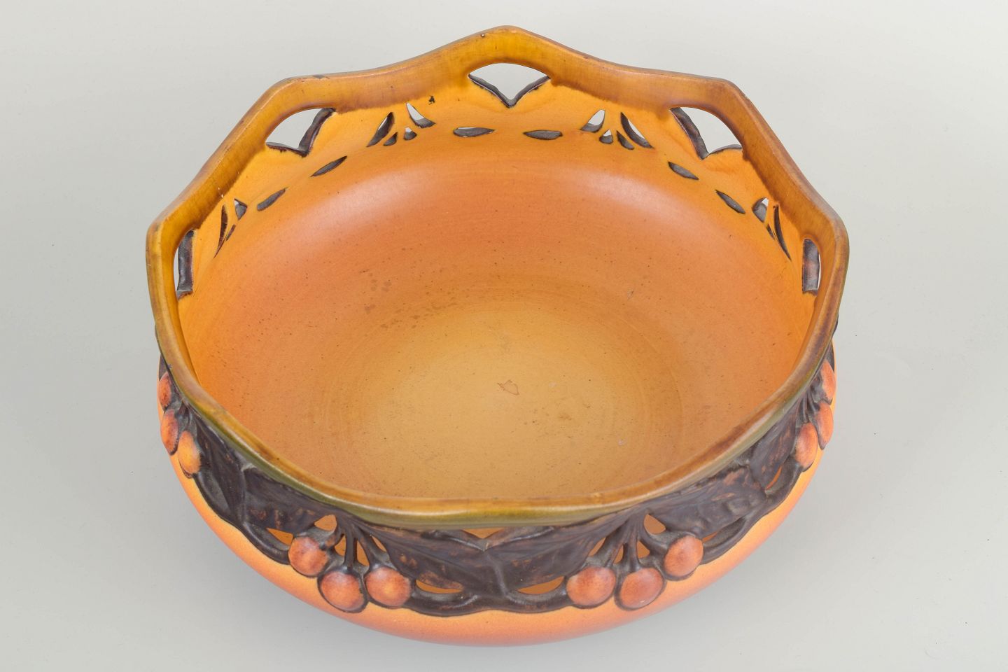 Art Deco / late Art Nouveau-inspired glazed ceramic bowl with openwork rim and sculpted relief of cherries and leaves in brown and green tones. Matte orange glaze with soft tonal grading toward the base.