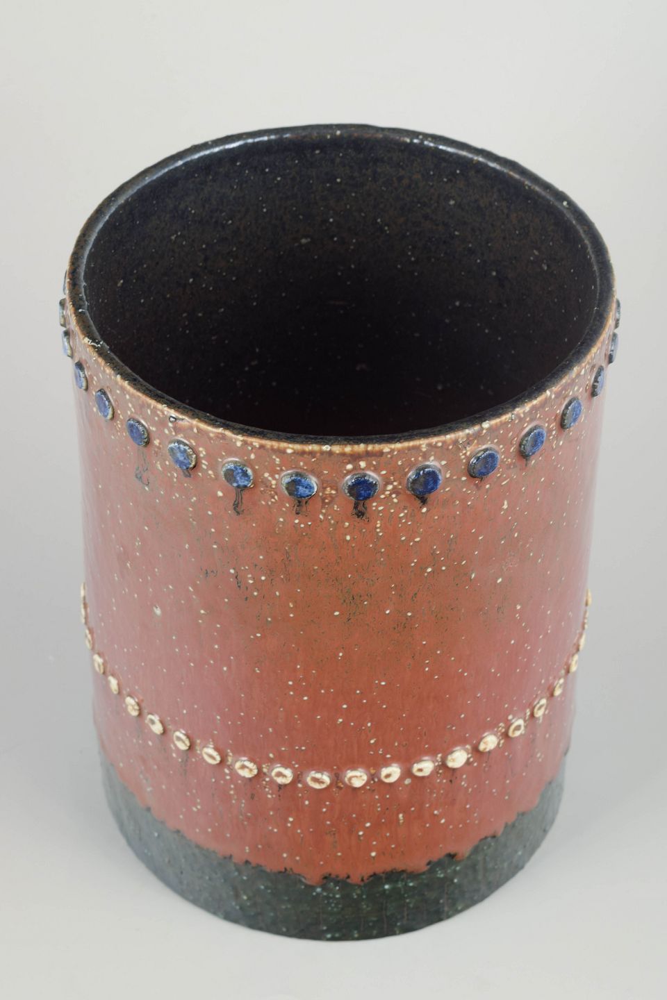 Cylindrical hand-thrown stoneware vase with warm reddish-brown glaze, dark interior glaze and decorative bands of applied blue and light ceramic studs in relief.