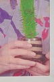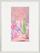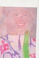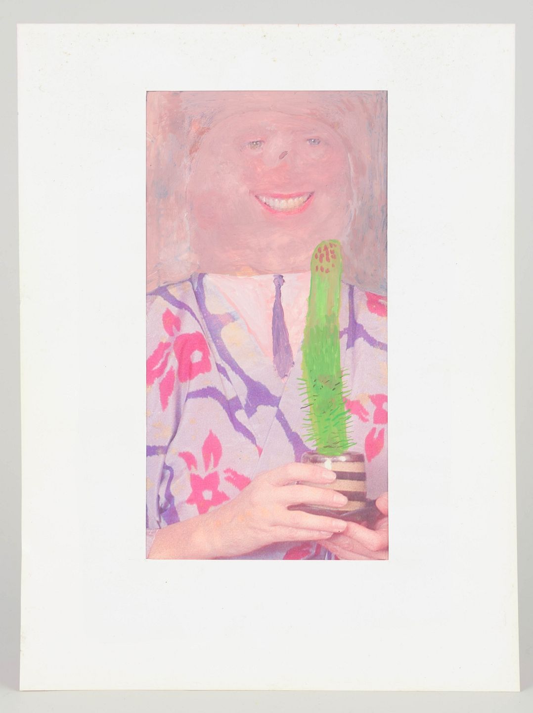 Naivist and humorous portrait of a smiling figure in a patterned kimono holding a cactus in a pot. Subtly surreal with a decorative palette in pink, lilac and greens.