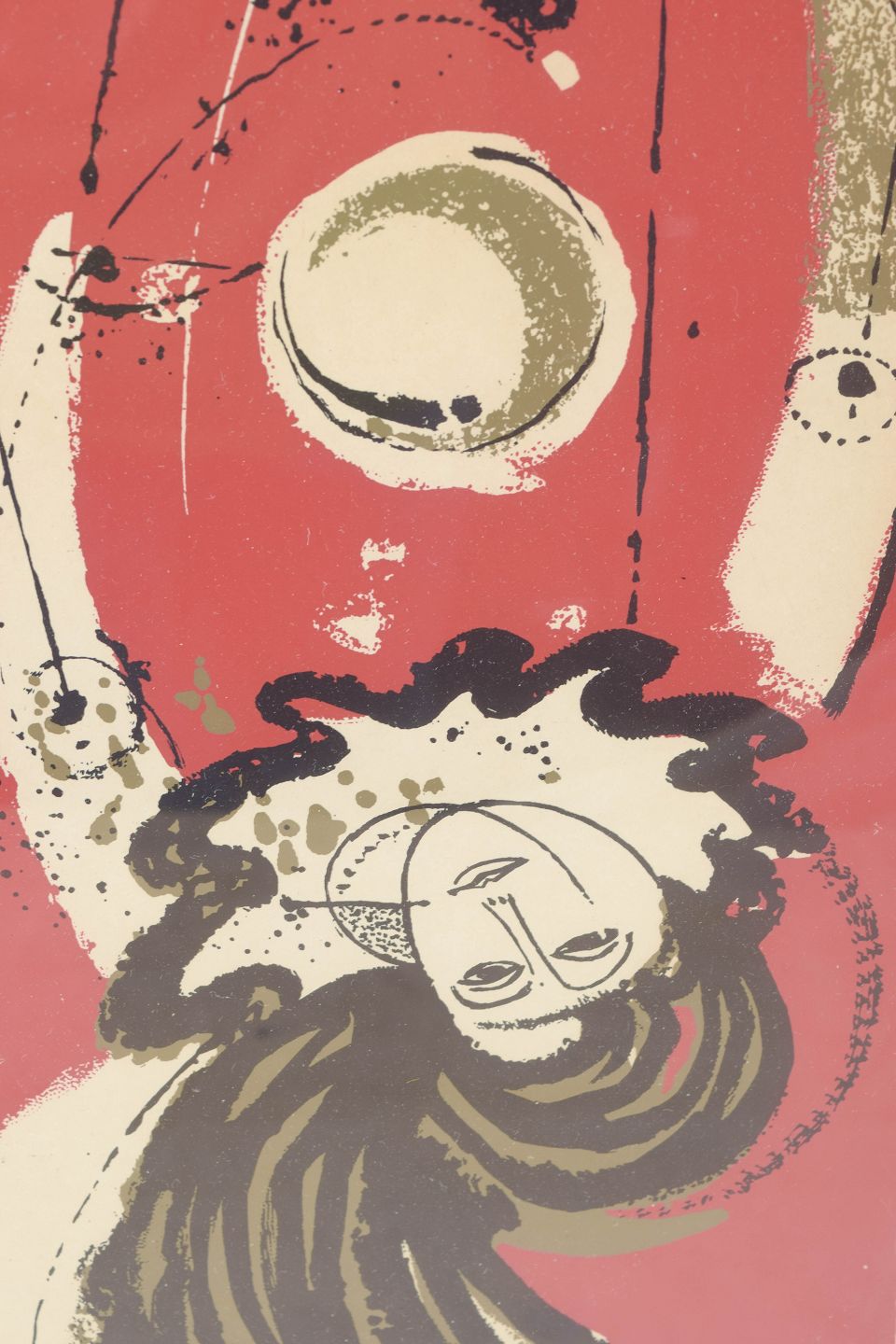 Abstract composition with stylized cosmic figures and graphic forms in red, gold and black tones, characteristic of Arenhill’s poetic visual language inspired by theatre, music and dreamlike sequences.