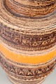 Cylindrical stoneware vase with characteristic incised banding and warm orange-brown relief glazing.