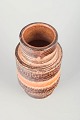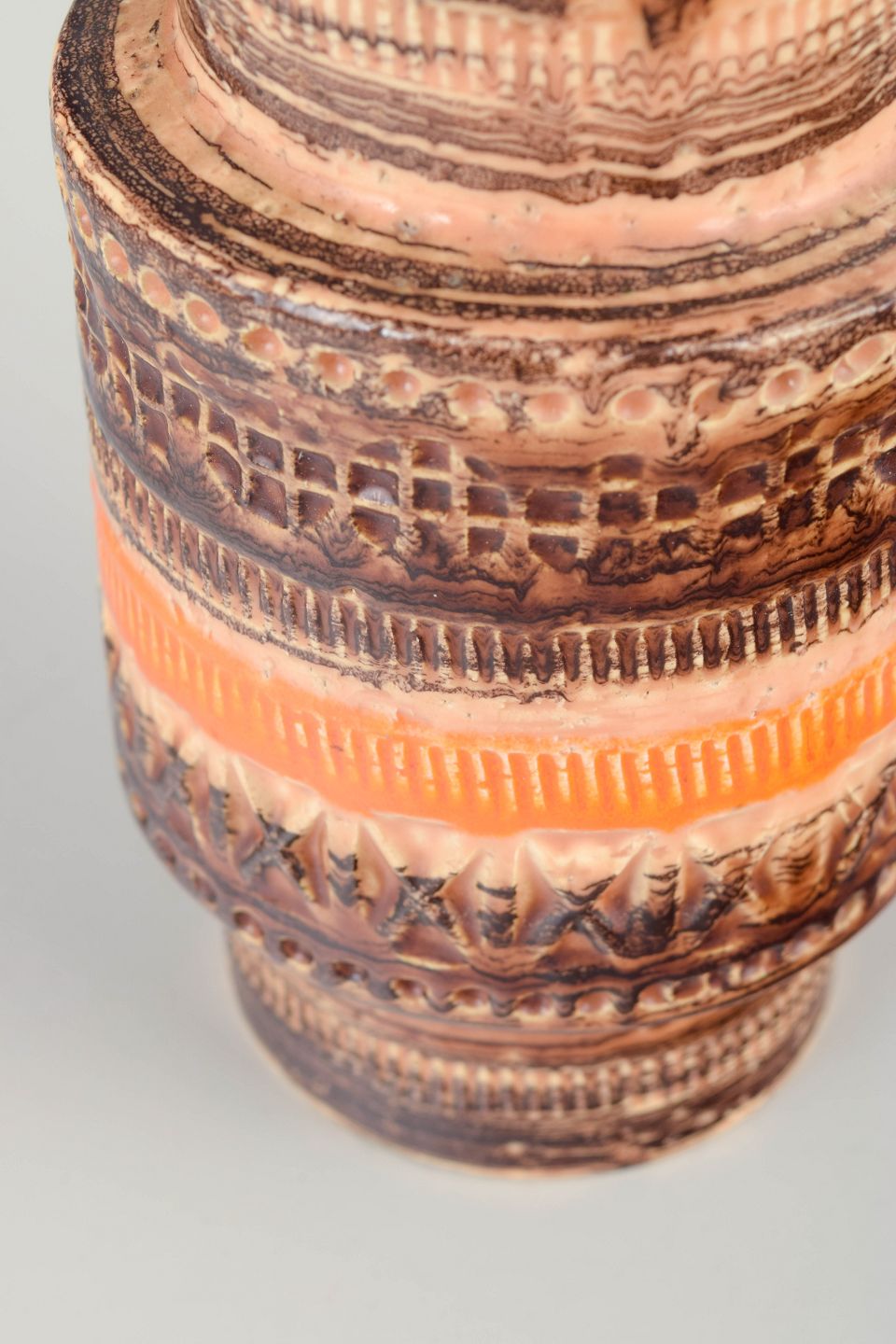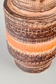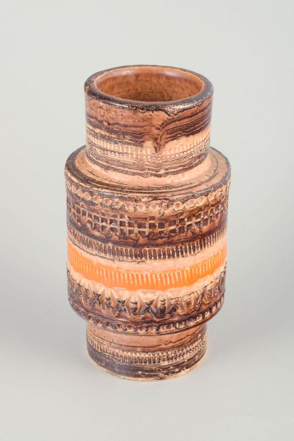 Cylindrical stoneware vase with characteristic incised banding and warm orange-brown relief glazing.