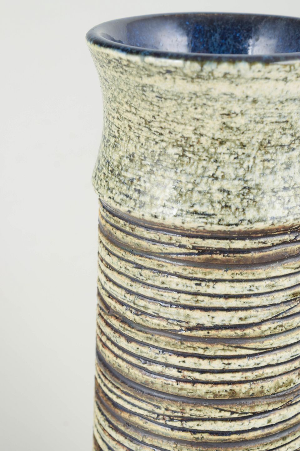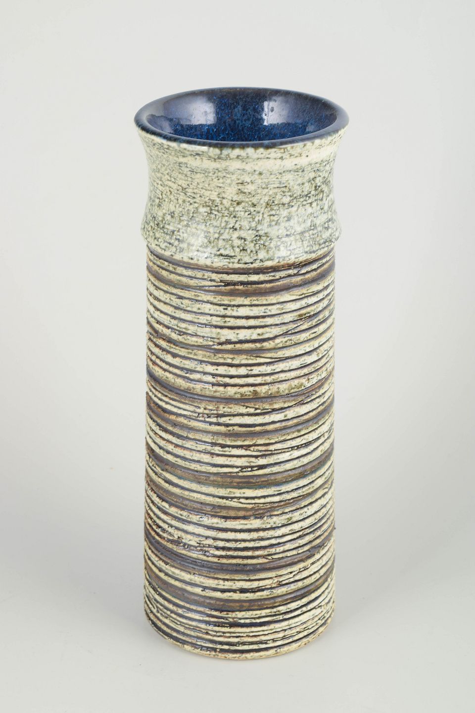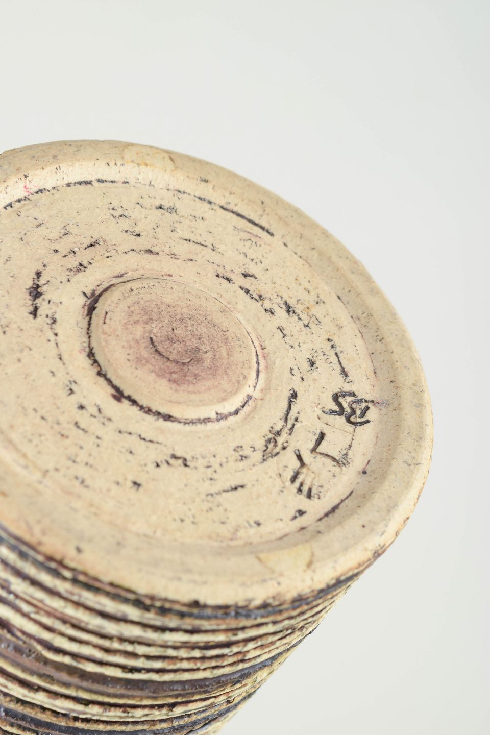 Cylindrical form with hand-turned horizontal relief texture and dark glazed interior. Signed “BS” to the base.