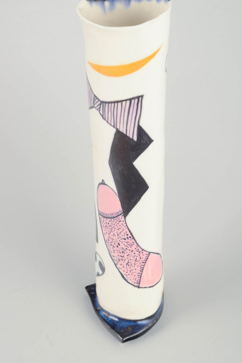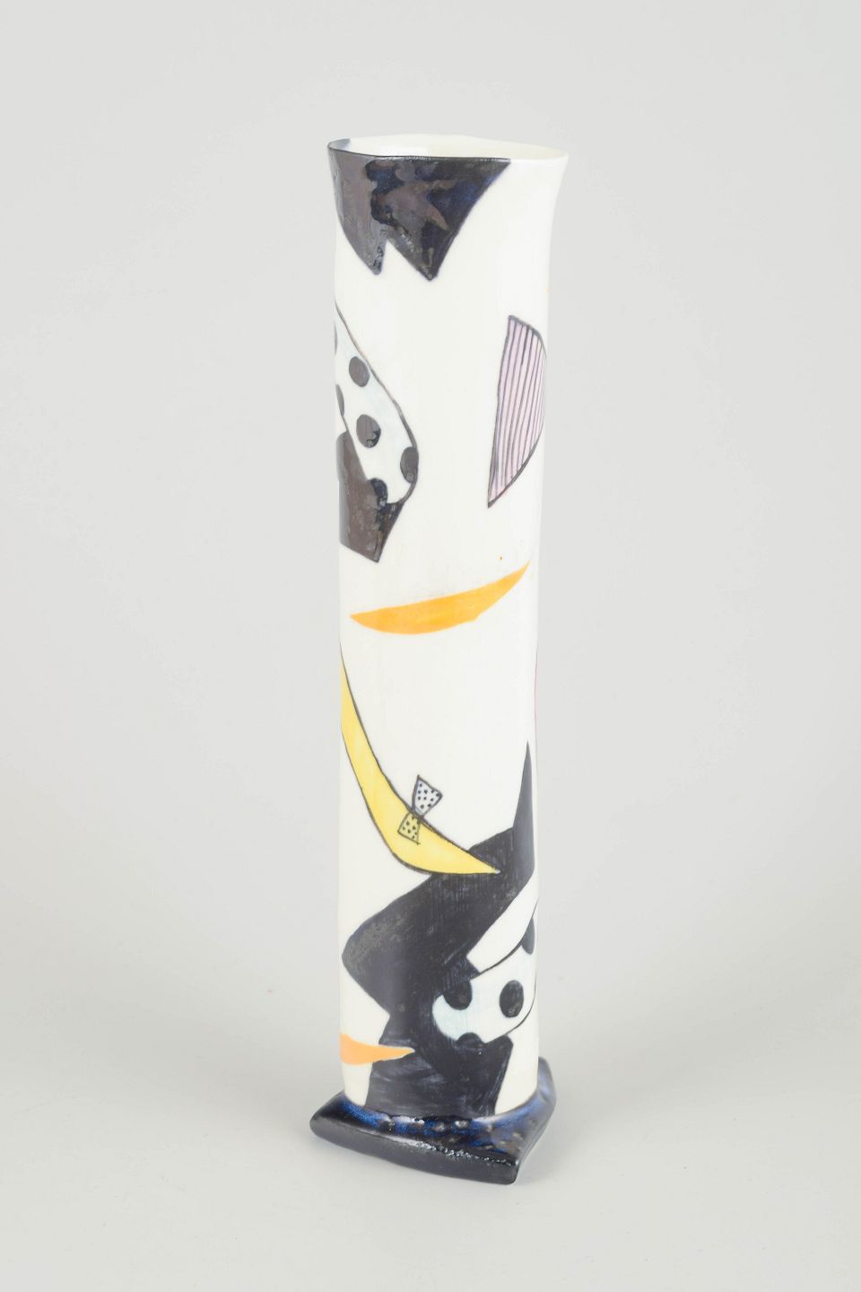 Handmade triangular studio vase in white-glazed stoneware with graphic, Memphis-inspired decoration in blue, yellow and black tones.