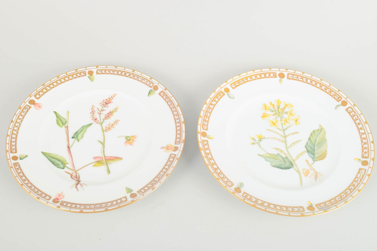 Two porcelain plates with hand-painted botanical motifs and gilt borders. 2nd quality.