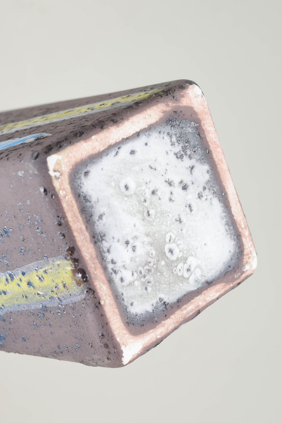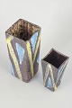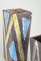 Pair of unique rectangular ceramic vases with bold graphic hand-painted relief decoration in blue, yellow and white glazes over a matte brown, chamotte-textured stoneware body.