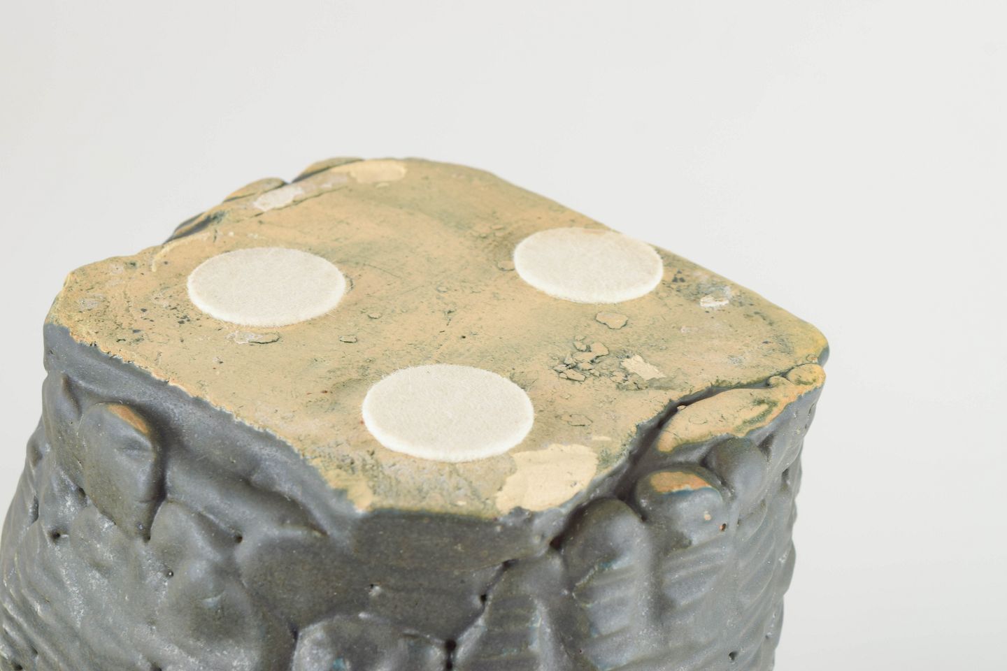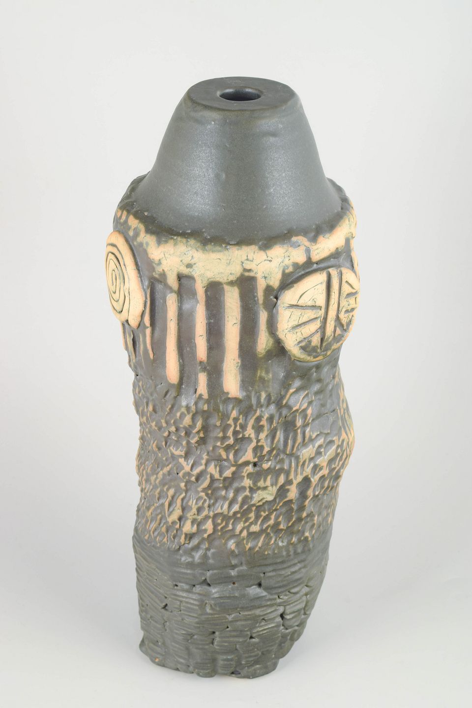Large, sculptural floor vase in hand-built stoneware with a raw, heavily textured surface and relief ornamentation in beige and light pink tones against a dark greyish body.