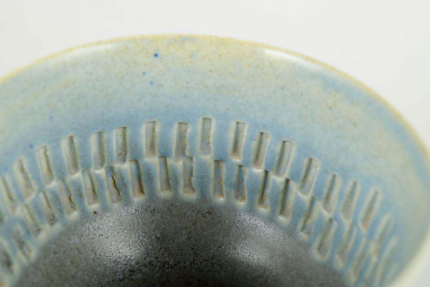 Unique hand-thrown studio bowl in stoneware with an experimental test glaze in soft blue-green tones featuring subtle interior colour gradation and decorative vertical glaze accents. Unsigned.
