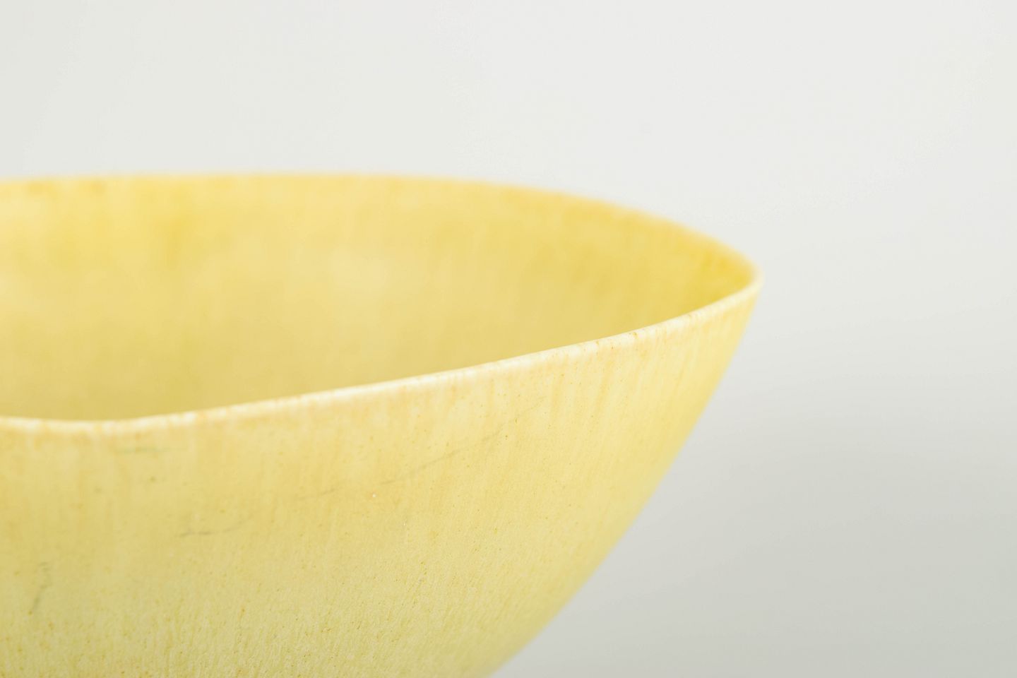 Hand-thrown small stoneware bowl with an elegant rounded form and characteristic warm yellow tenmoku glaze. Classic Friberg micro-glaze texture with small glaze bubbles from firing (see photo).