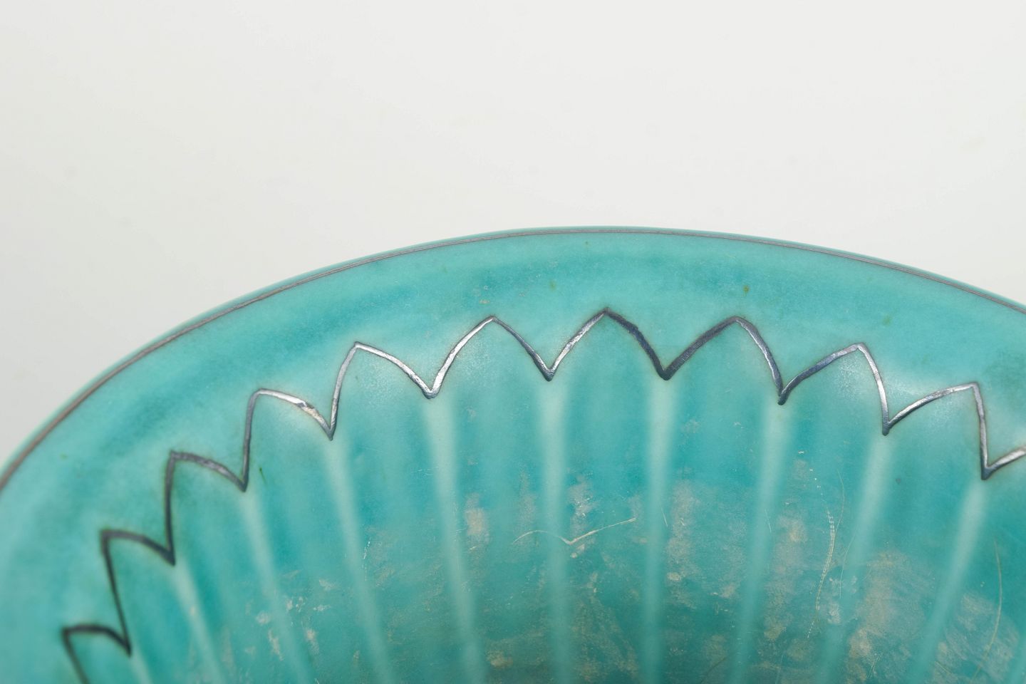 Stoneware with turquoise glaze and inlaid silver details. Decorated with vertical fluted panels and small silver-inlaid flowers along the sides and a scalloped rim. A fine early Argenta piece showing clear Art Deco influence. Light lime residue in the interior.