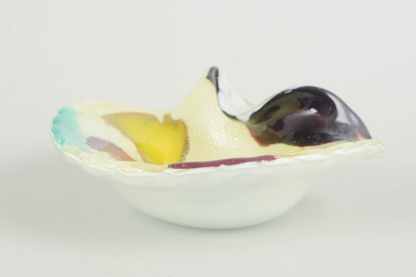 Dekorativ kunstglas skål i håndblæst glas med asymmetrisk form og flerfarvet glasur i gule, røde, turkise og mørke toner. Skålen har en udtalt plastisk form med bølgende kant og indre tekstur, typisk for Murano-glasværkernes eksperimenterende periode i midten af det 20. århundrede.