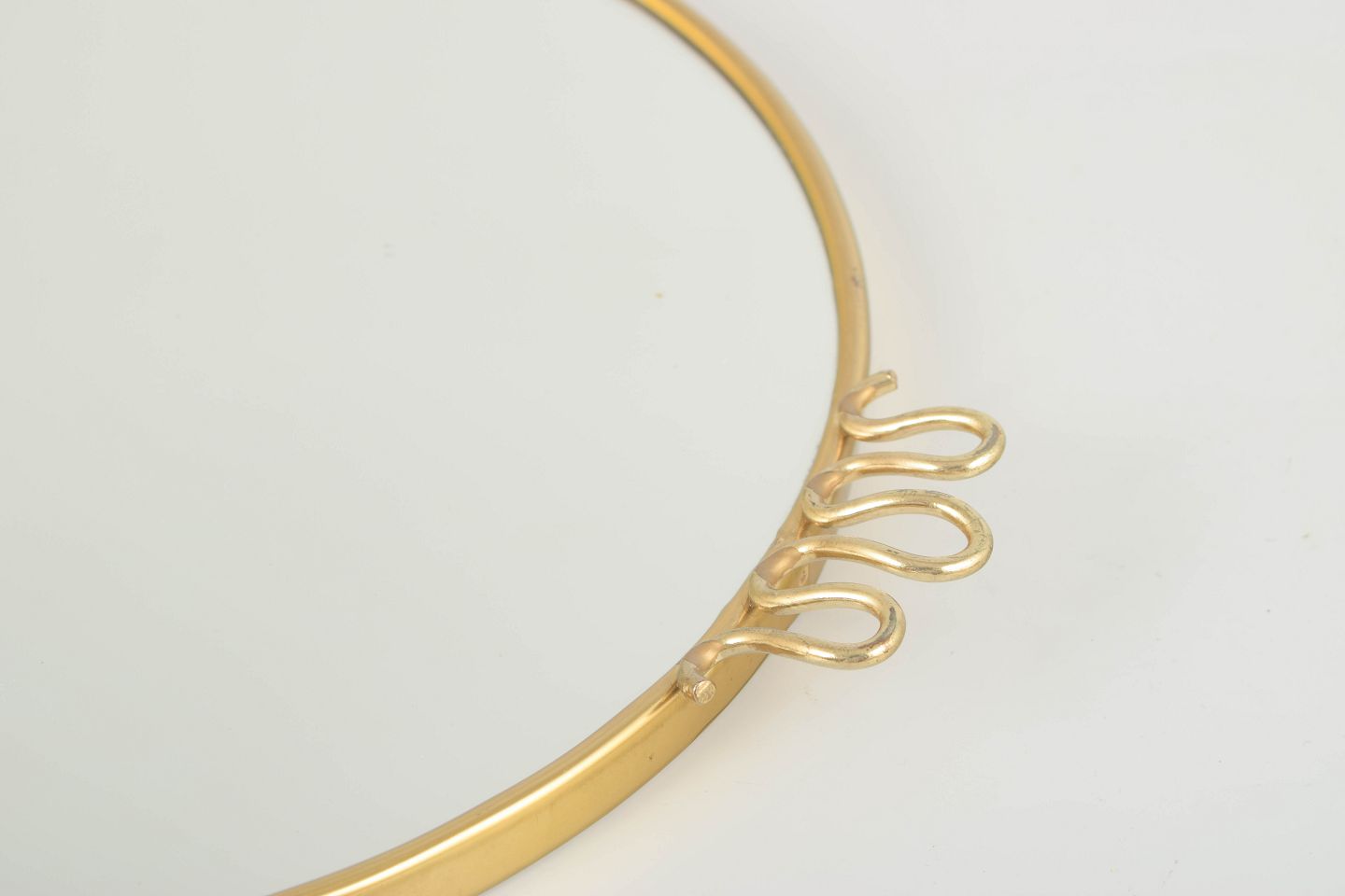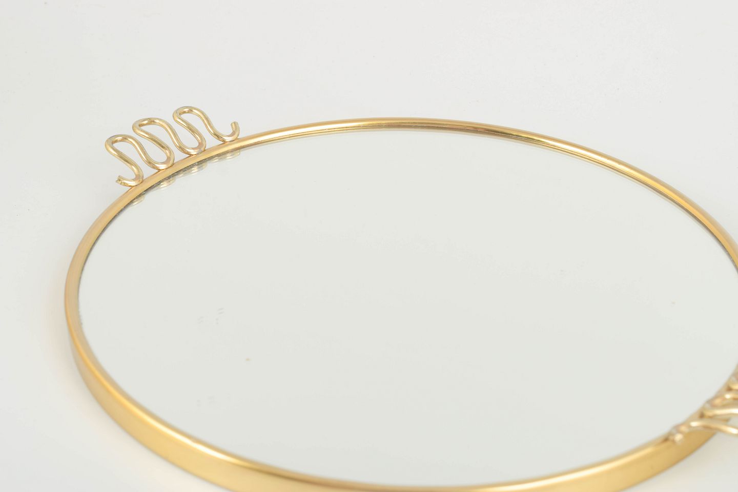 Elegant round tray with mirrored glass and polished brass rim. The gracefully curved handles evoke the refined, classic expression of the Swedish Grace style inspired by Art Deco.
