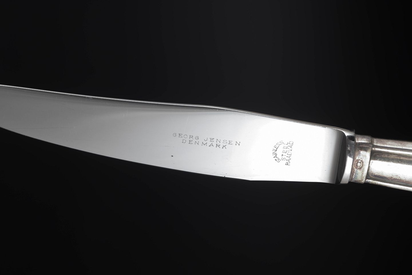 The “Lily of the Valley” pattern was introduced in 1913 and remains one of Georg Jensen’s most iconic flatware designs. Inspired by Art Nouveau and Scandinavian naturalism, the pattern combines classical elegance with exquisite craftsmanship. Produced throughout the 20th century in various versions with both silver and steel blades, it is today regarded as one of the most sought-after classics in Danish silver design.