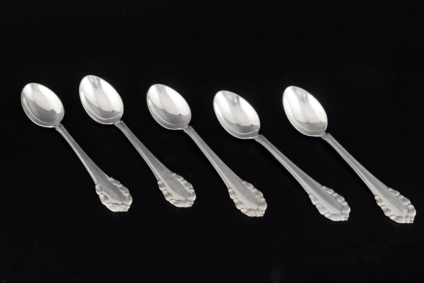 Set of five small sterling silver coffee spoons by Georg Jensen in the classic “Lily of the Valley” pattern. Elegantly crafted with rounded lines and floral ornamentation in the Art Deco style. Stamped with silver marks and “Georg Jensen”.