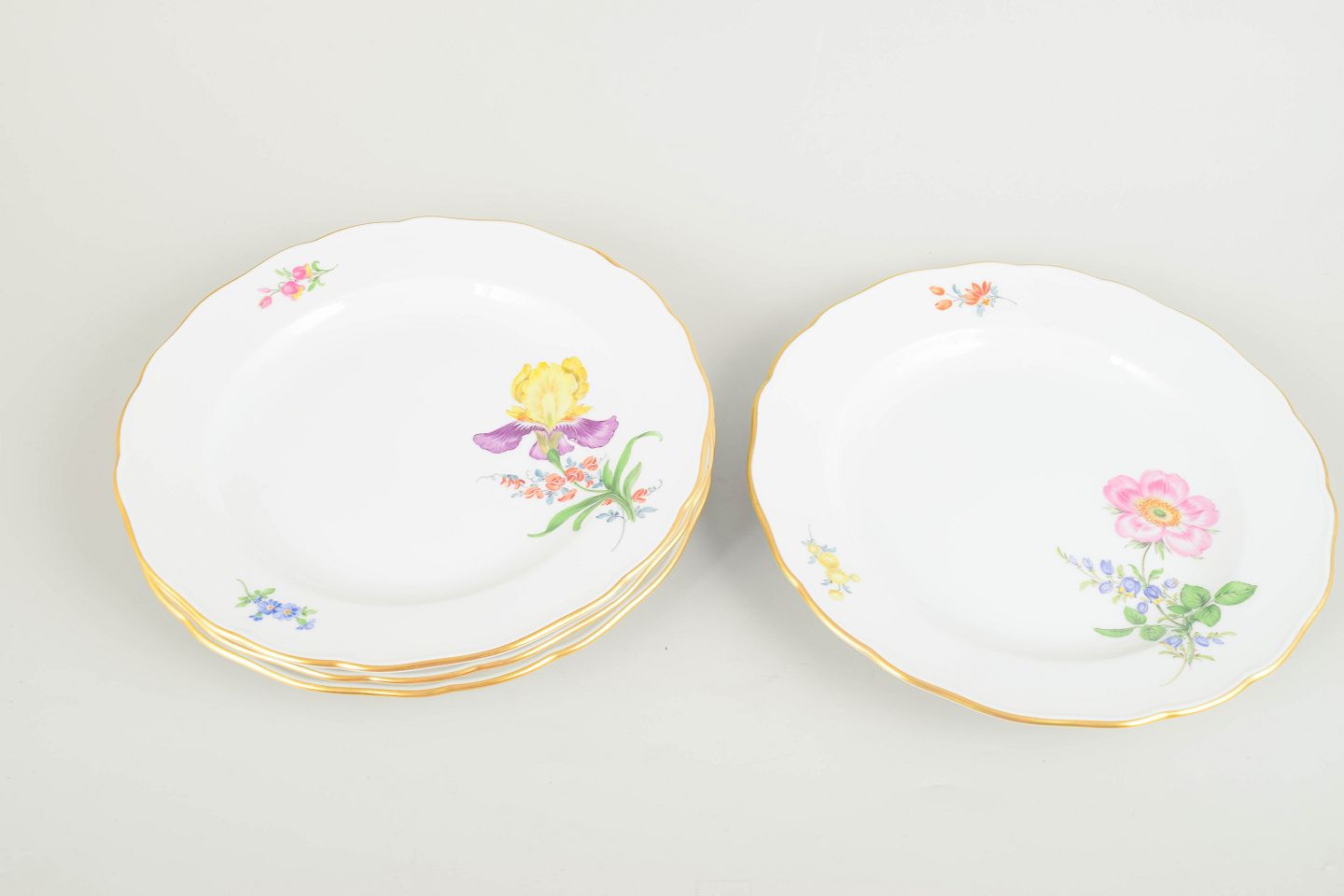 Fire antikke Meissen-tallerkener i porcelæn med håndmalede blomsterdekorationer og forgyldt kant. Klassisk form med svungen rand og detaljerede polykrome buketter, udført i den høje kvalitet Meissen er kendt for.