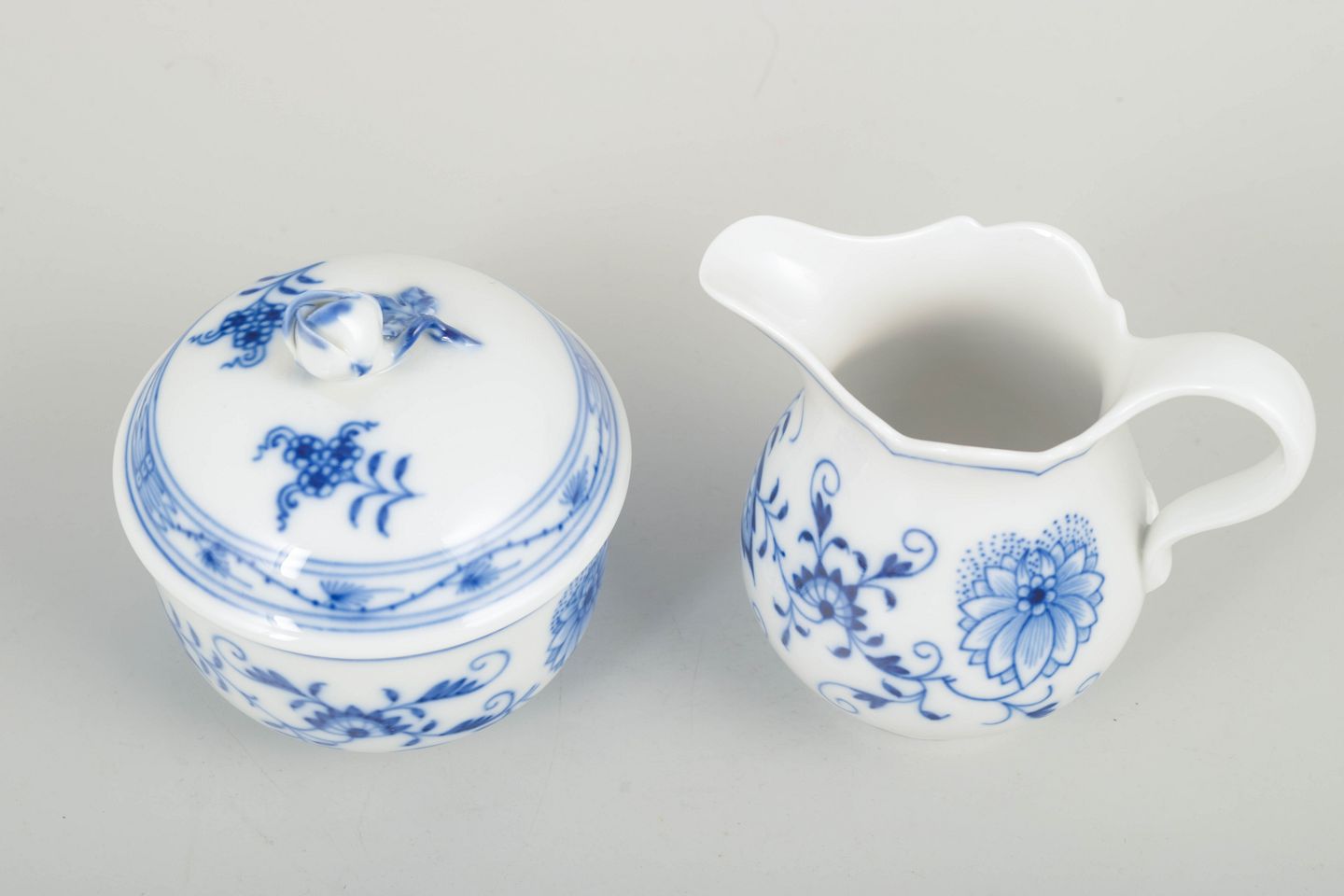 Meissen Blue Onion sugar bowl and creamer, mid-20th century.