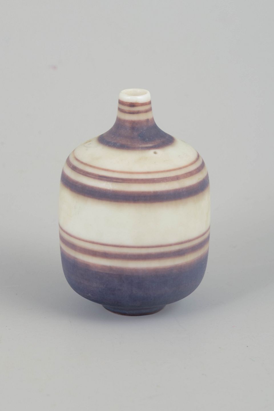 Hand-thrown stoneware miniature vase with characteristic soft striped decoration in violet and cream tones. A refined small form displaying Nylund’s distinctive sense of proportion and tactile surface treatment.