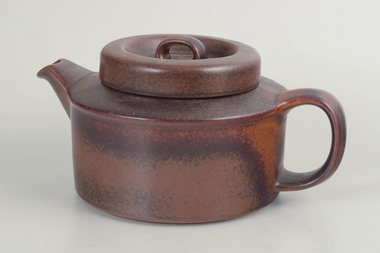 Kompakt tekande i stentøj fra Arabia, udført i serien Ruska med karakteristisk, meleret brun glasur i varme jordtoner. Lav, cylindrisk form med integreret tud, bred hank og fladt låg med ringgreb.