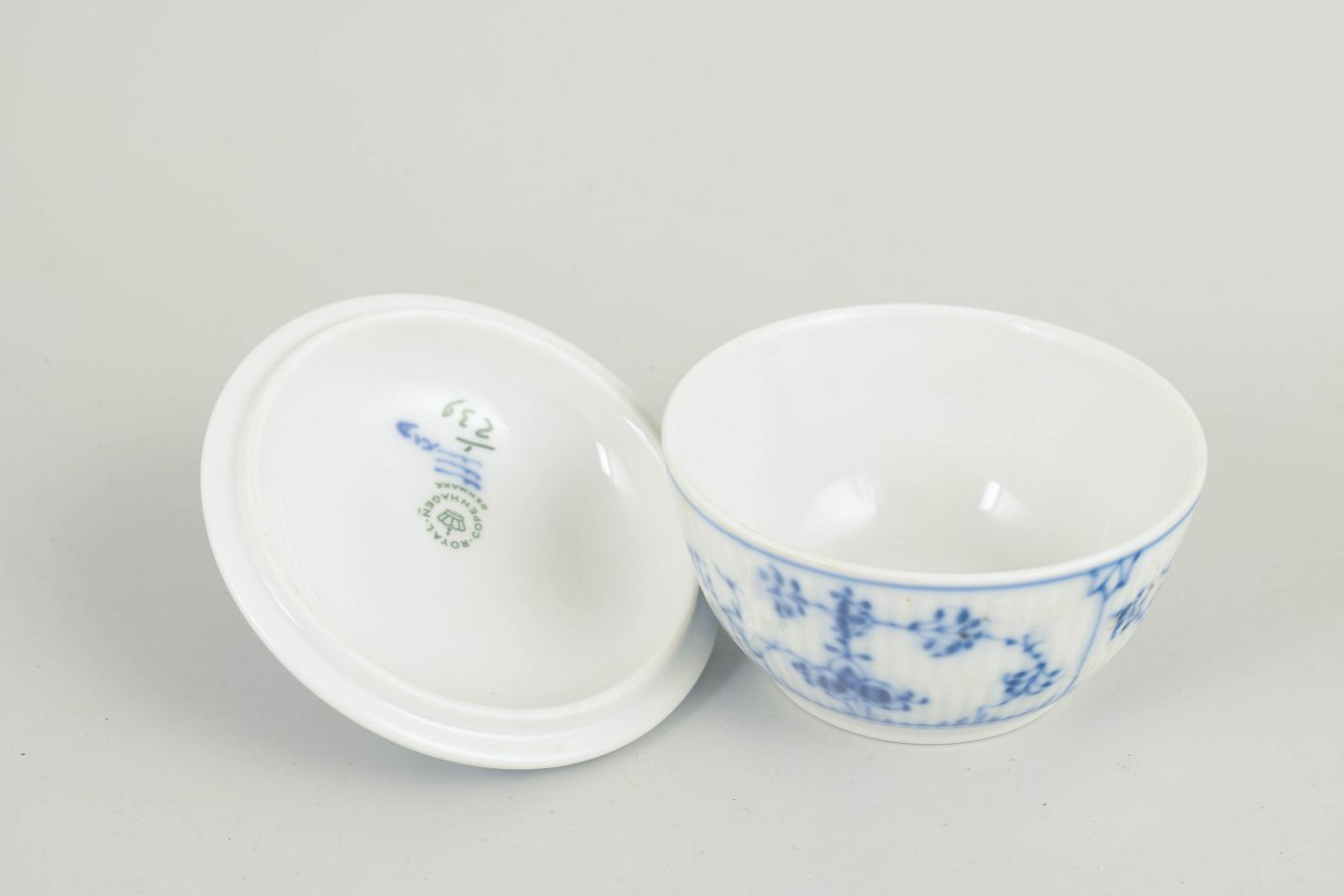 Fluted sugar bowl in glazed porcelain with hand-painted cobalt-blue underglaze decoration. Classic rounded form with matching lid topped by a finial. Model 1/239.