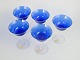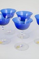 Set of five handmade art glass champagne glasses with deep blue bowls and clear, elegant stems. The glasses feature a balanced, period-specific design in which the coloured bowls contrast with the transparent stems and bases. A characteristic example of Swedish art glass from the 1960s and 70s, combining colour and function in a restrained and refined form. The model is executed as coupe-style champagne glasses.