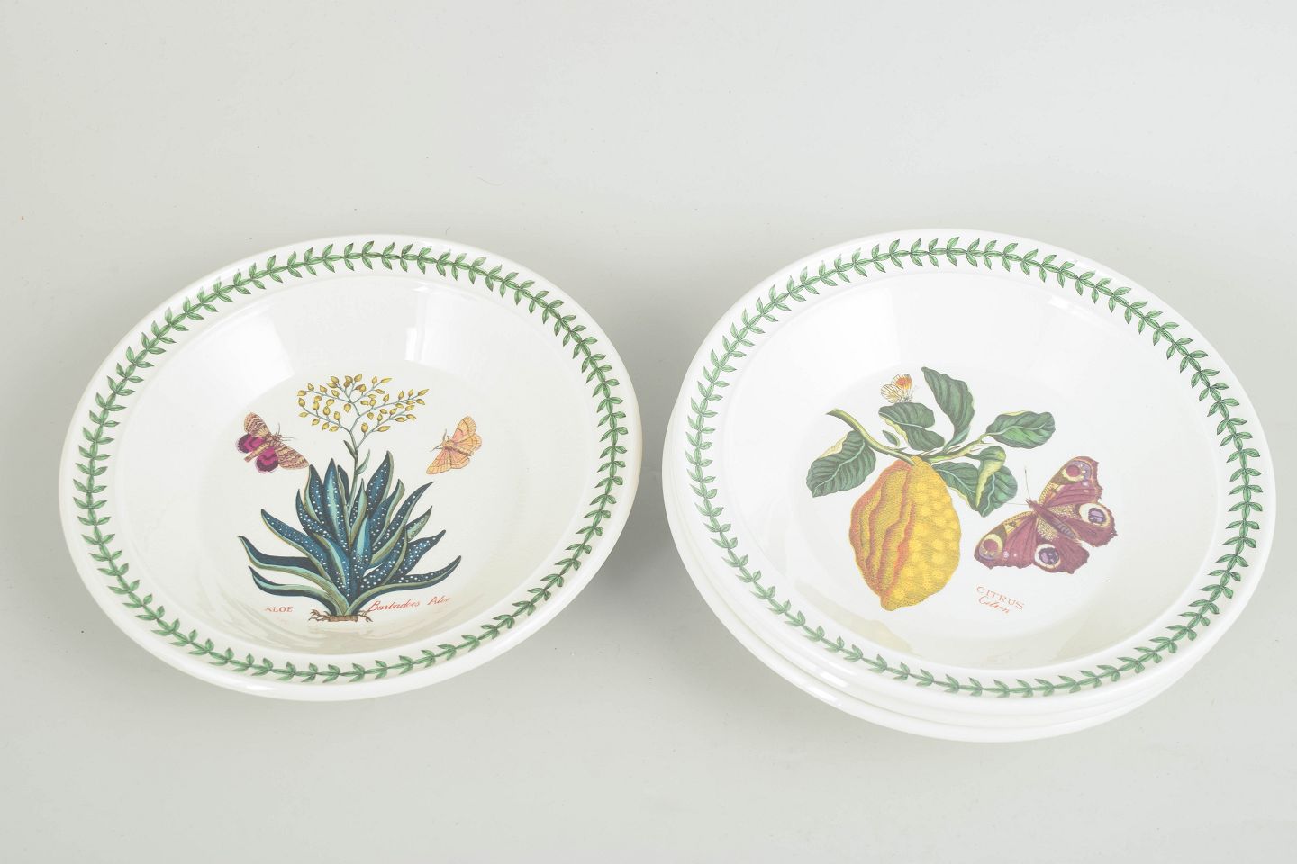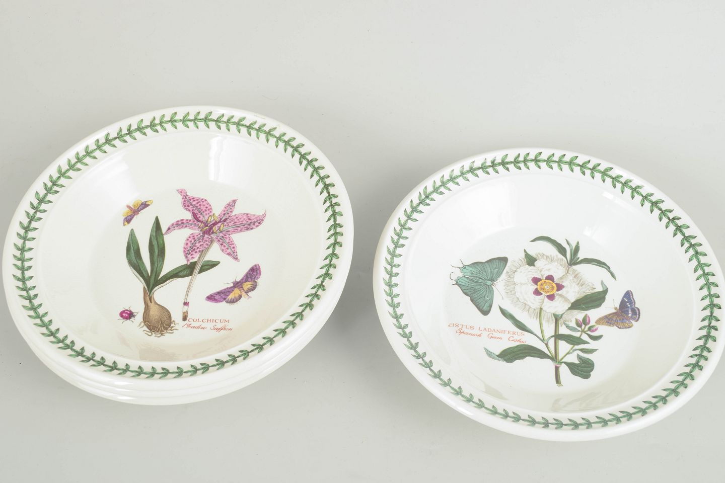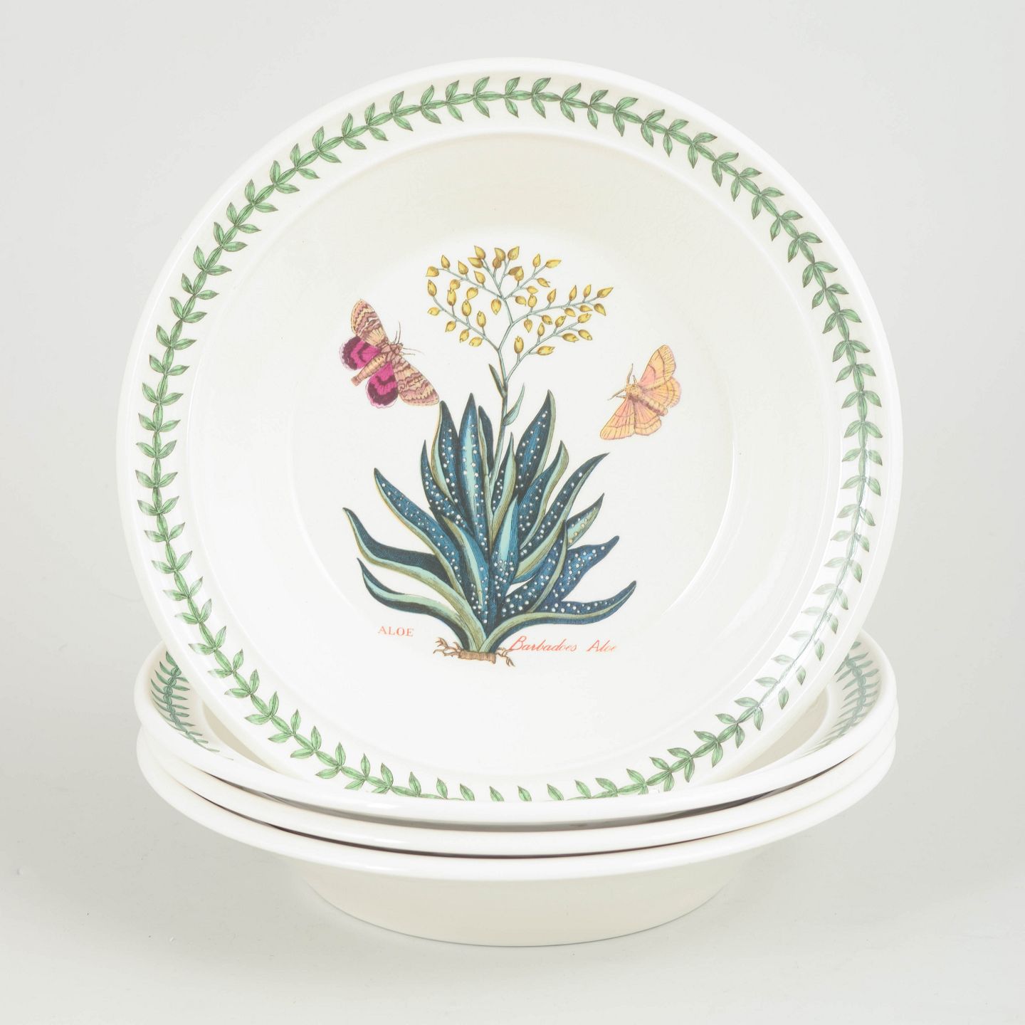 Set of 4 deep faience plates by Portmeirion, decorated in “The Botanic Garden” series with botanical motifs and the characteristic green leaf border.