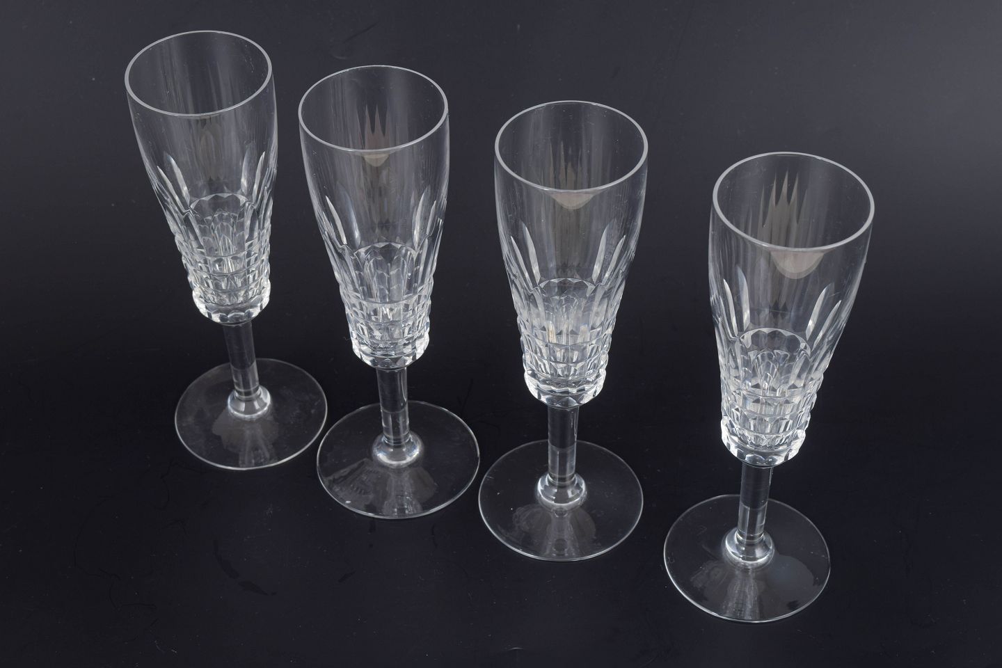 Sæt på fire franske champagneglas i klart krystal med facetteret kumme og klassisk stamme. Form og slibning giver et elegant lysspil og et tidstypisk udtryk fra midten af det 20. århundrede.