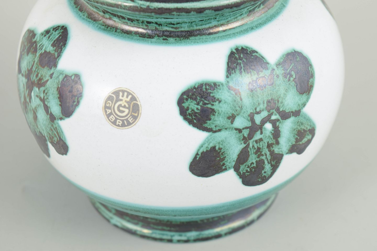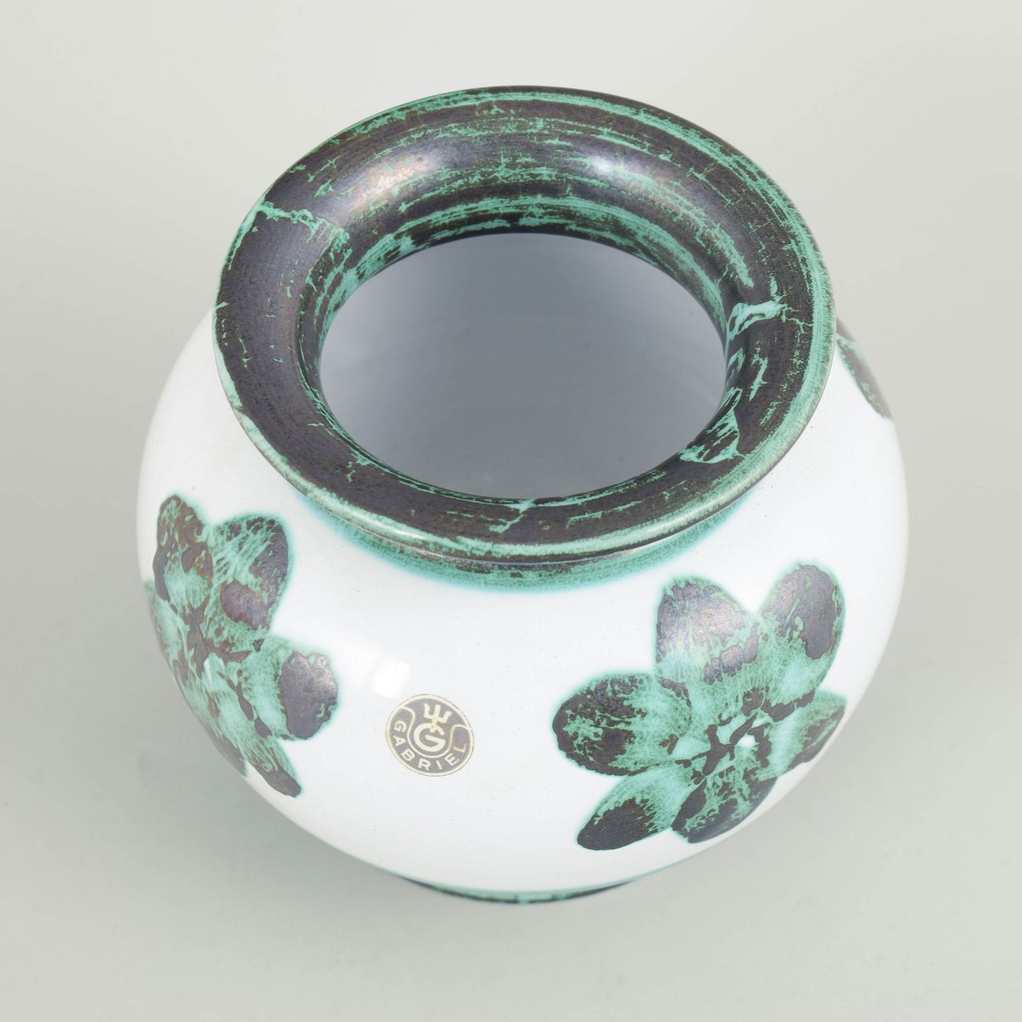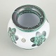Globular vase in glazed faience with a white ground and stylised floral decoration in green and dark tones. Accented with a contrasting green rim and foot. Factory sticker with model number 121.