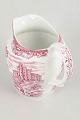 Faience pitcher decorated in red transferware with castle motifs and ornamental border, from the Olde Country Castles series.