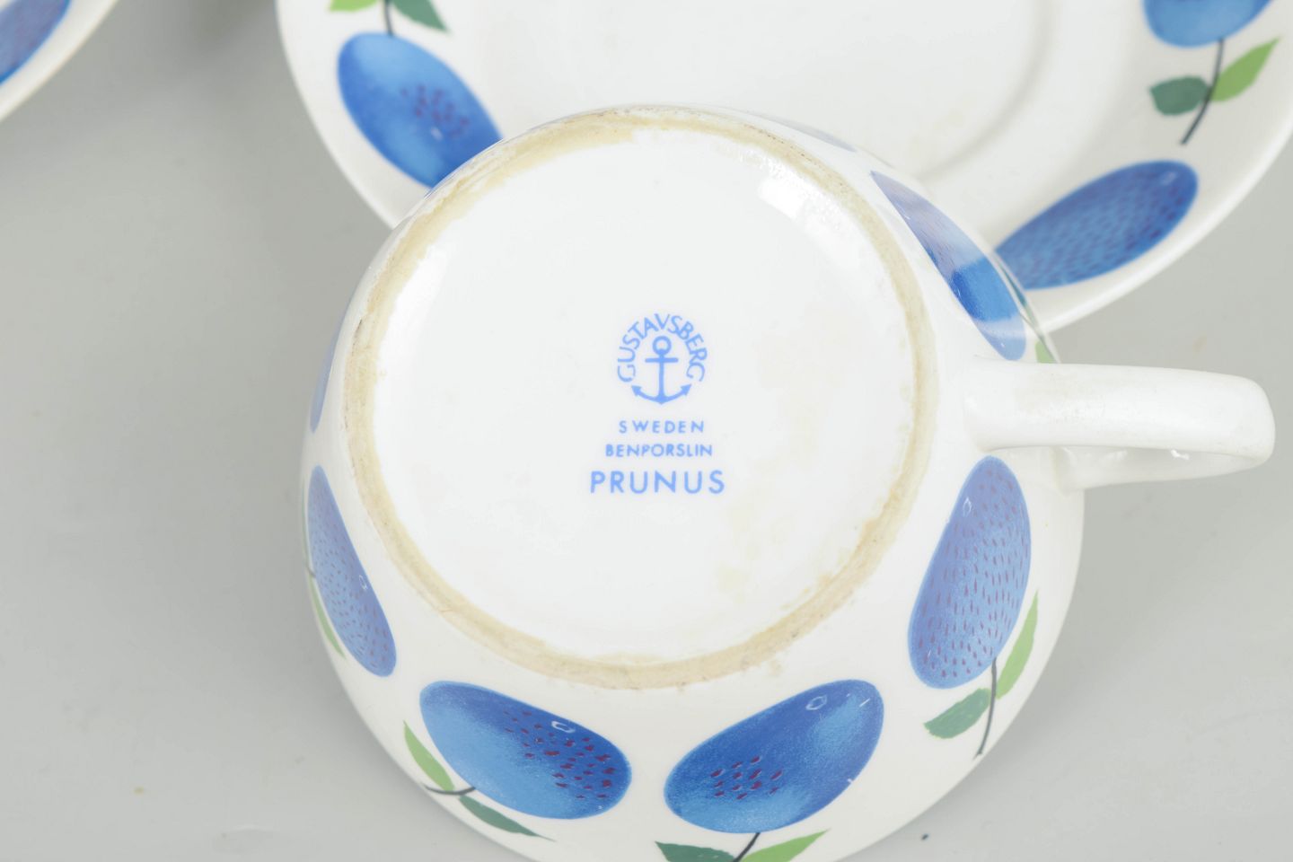 Stig Lindberg for Gustavsberg – “Prunus” teacups with matching saucers.