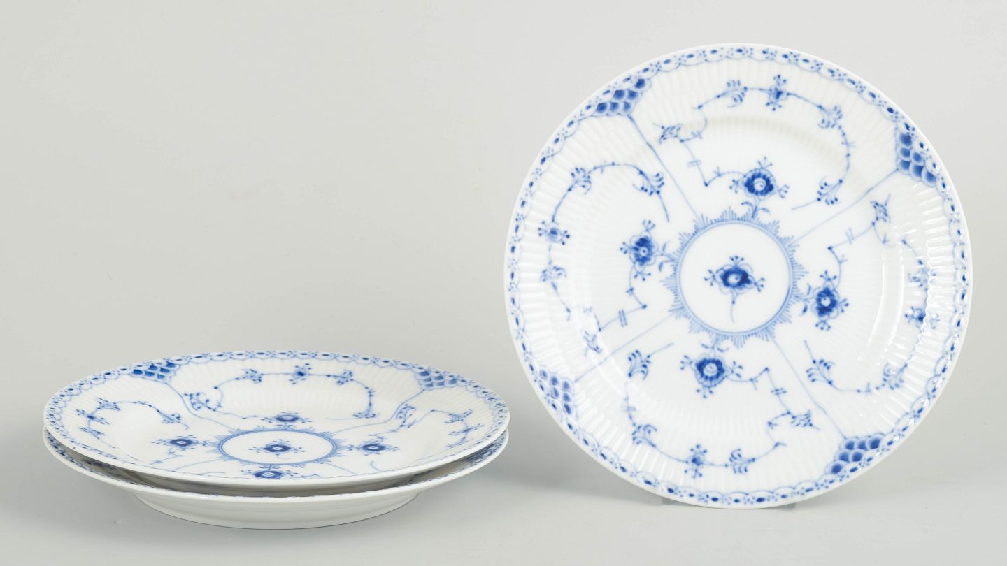 Sæt af tre frokosttallerkener i håndmalet porcelæn fra Musselmalet Halvblonde med klassisk underglasurdekoration i koboltblå, riflede felter og karakteristisk blondekant. Model 1/573. Første sortering.