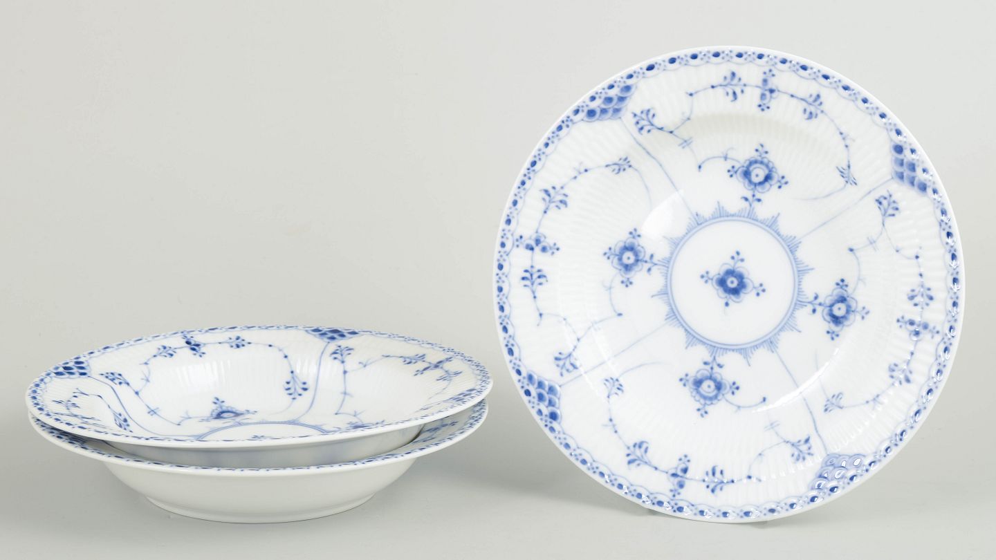 Sæt af tre dybe tallerkener i håndmalet porcelæn fra Musselmalet Halvblonde med klassisk underglasurdekoration i koboltblå, riflede felter og karakteristisk blondekant. Model 1/566. Annulleret med én indridset streg under bunden.