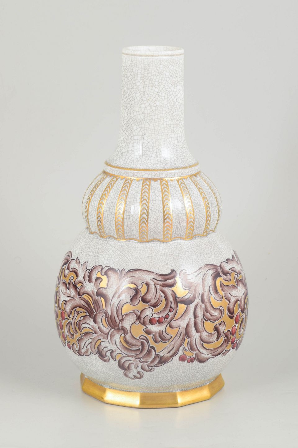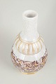 Elegant porcelain vase with tall slender neck and baluster-shaped body decorated with relief-style ornamentation in gilt and polychrome tones against a crackle glaze ground. The form and decoration reflect the refined decorative vocabulary of the art deco period. Model number 133/320, marked Dahl-Jensen Copenhagen underneath.