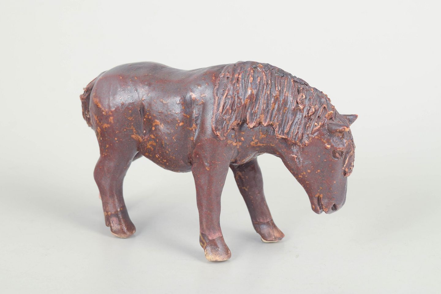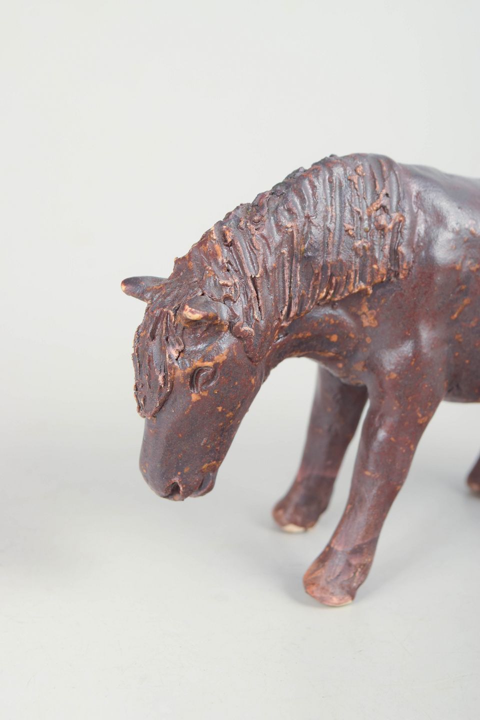 Unique ceramic sculpture depicting a pony, executed in stoneware with a dark brown glaze and subtle rust-coloured nuances. The figure is modelled with a natural posture and finely detailed mane and head, giving the piece a lively and expressive character. Unsigned unique work from the 1970s.