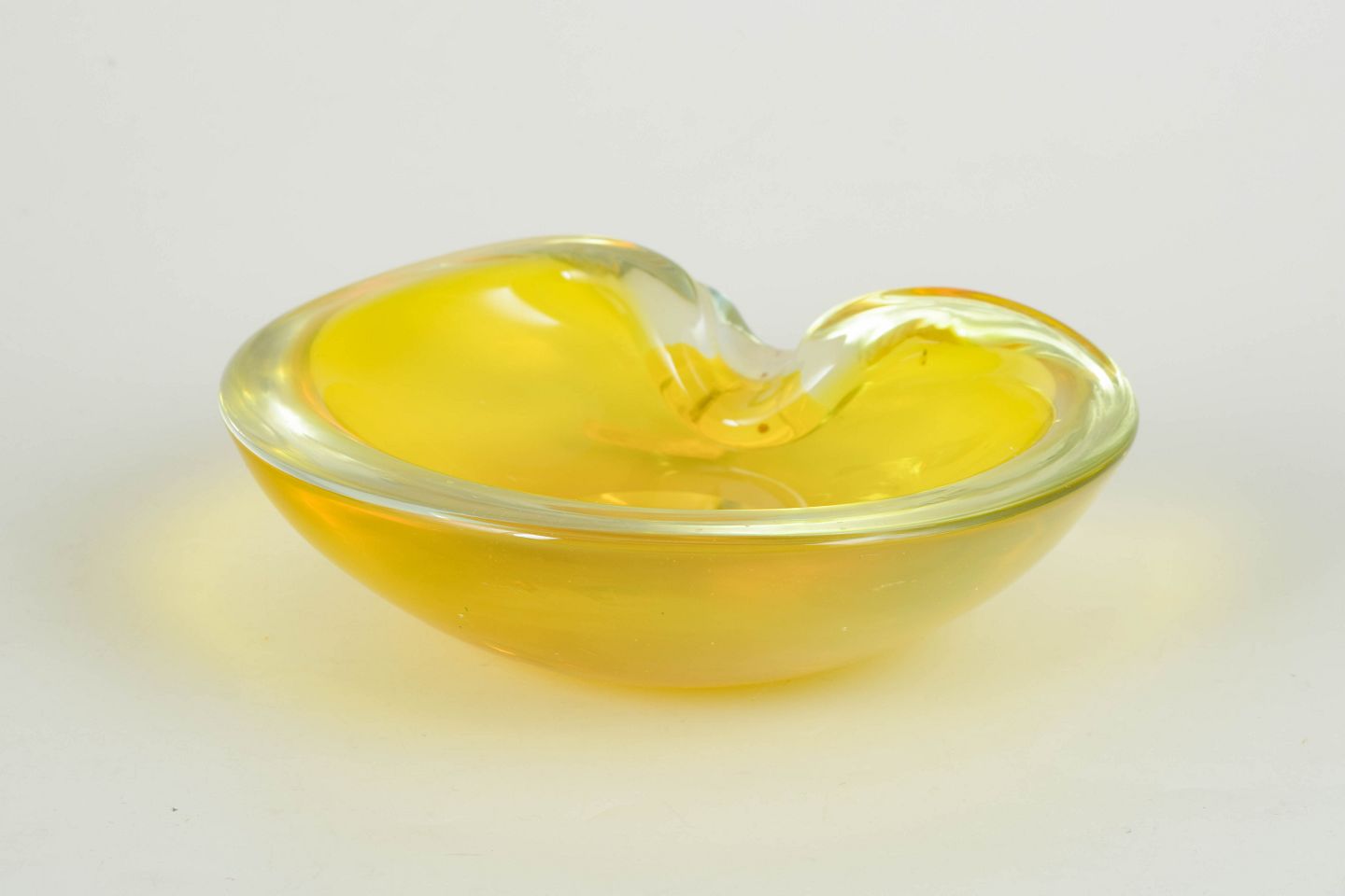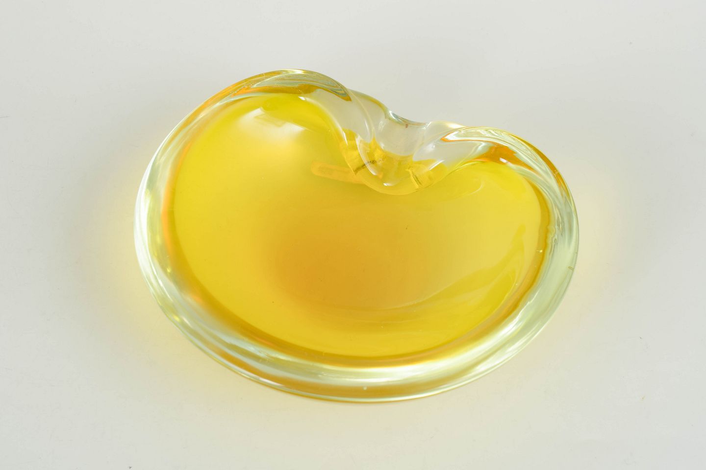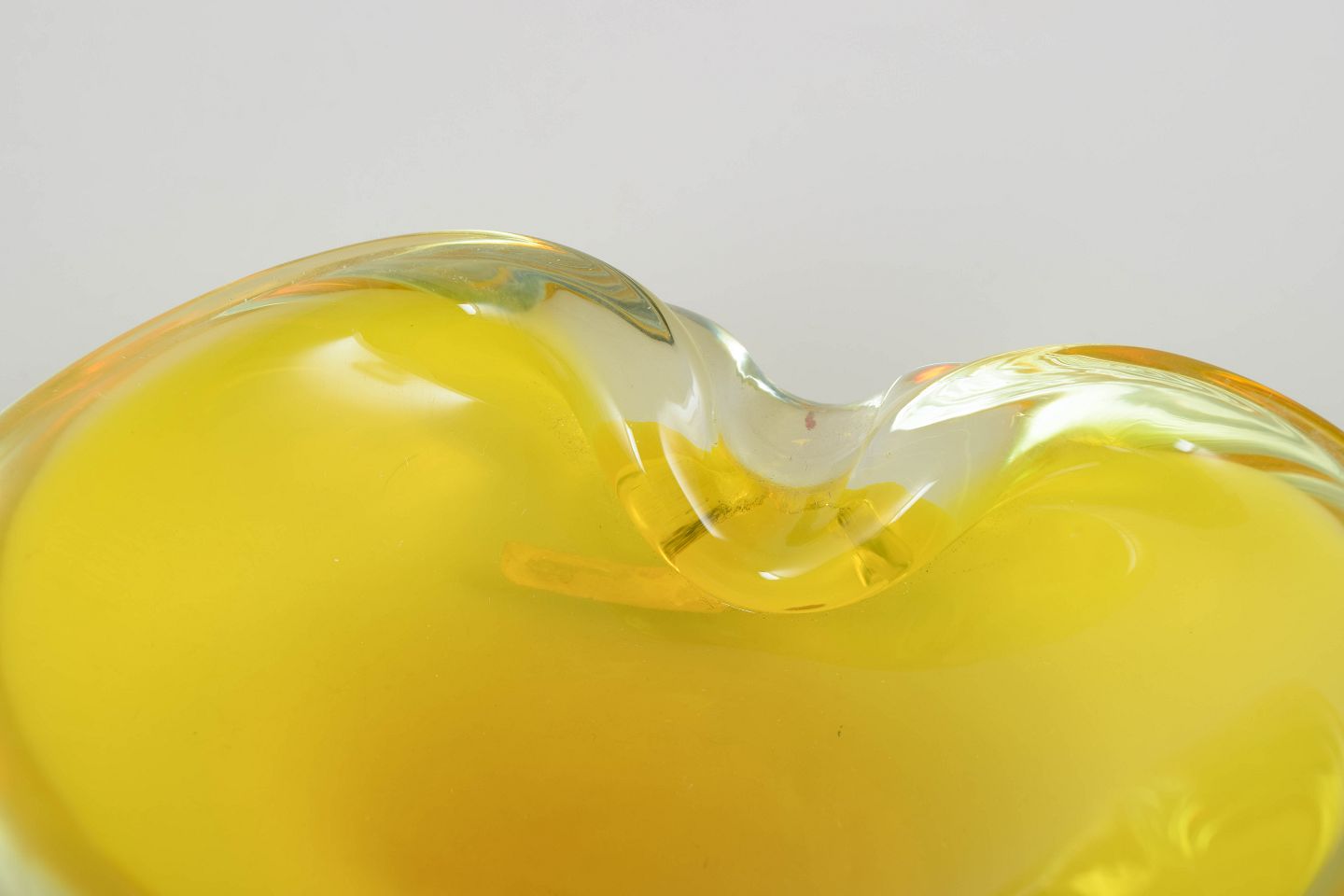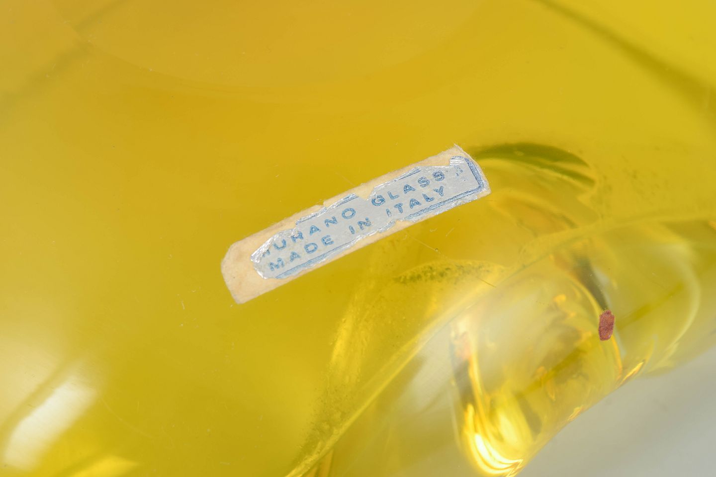 Organically shaped art glass bowl in yellow glass with clear rim and softly flowing form. Original label “Murano Glass – Made in Italy”.