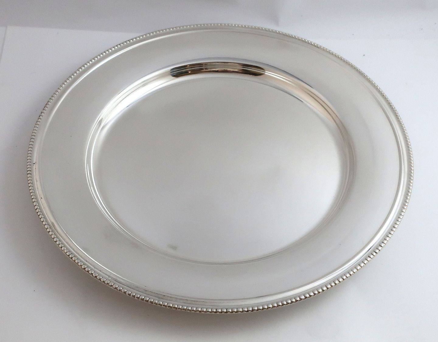 12 silver plated cover plates with pearl edge. Diameter 28 cm. Traces of wear on a few pieces.