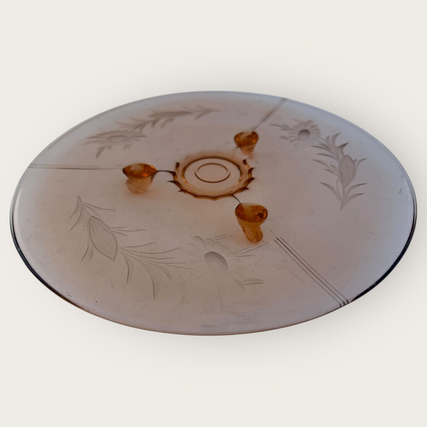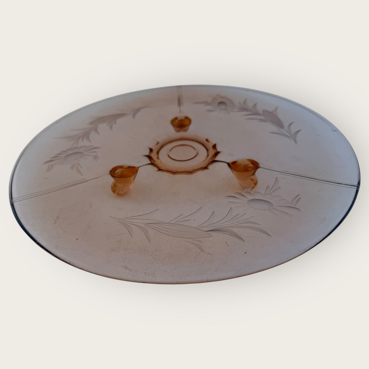 Pink glass dish with flower cuts and three feet, diameter 29cm *nice condition*