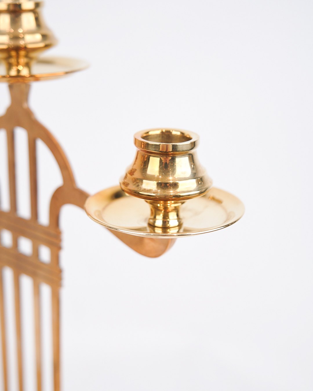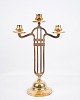 Set of two tall three-armed brass candlesticks from the 1920s in Art Nouveau style.