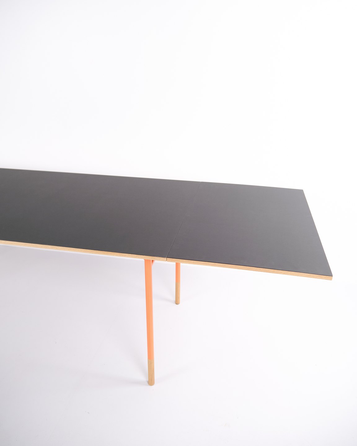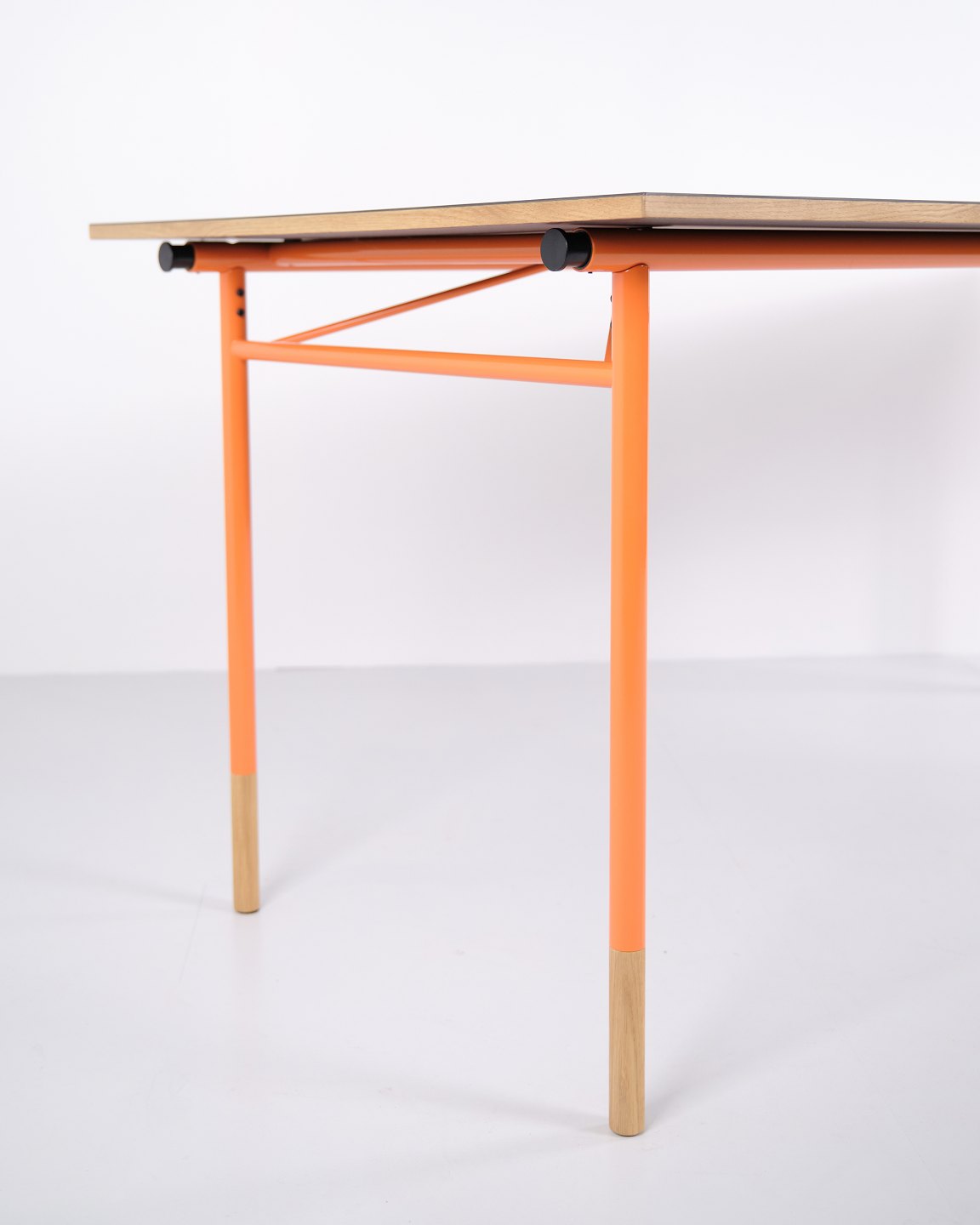 — Materials: Grey linoleum, oregon pine edges, orange-lacquered steel legs