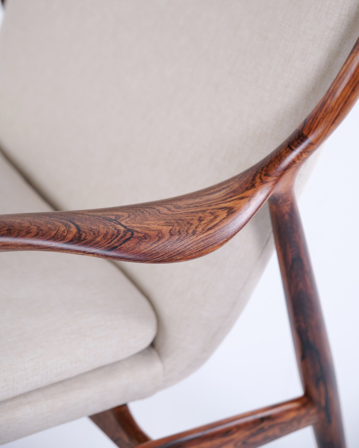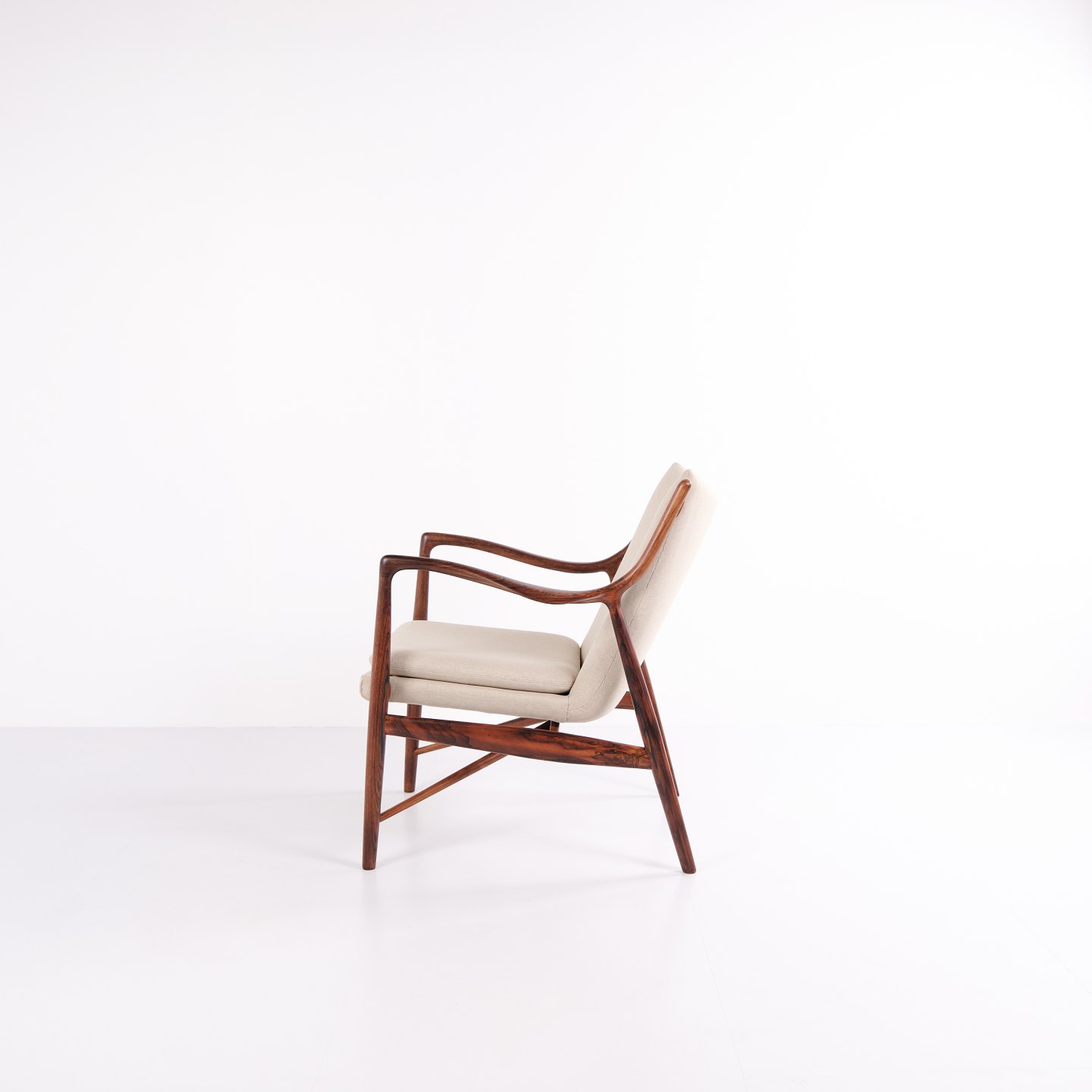 SoldIconic armchair, model NV45, designed by Finn Juhl and made by master cabinetmaker Niels Vodder in the 1950s. The chair is made of rosewood with a cantilevered seat and back upholstered in light fabric, which highlights Finn Juhl's characteristic sculptural design and light construction.
