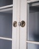 The cabinet stands on elegant, tapered legs and features an upper section with glass doors, giving it a light and classic appearance. Inside there are four shelves in the display section, while the lower section includes both a practical drawer and storage space.
