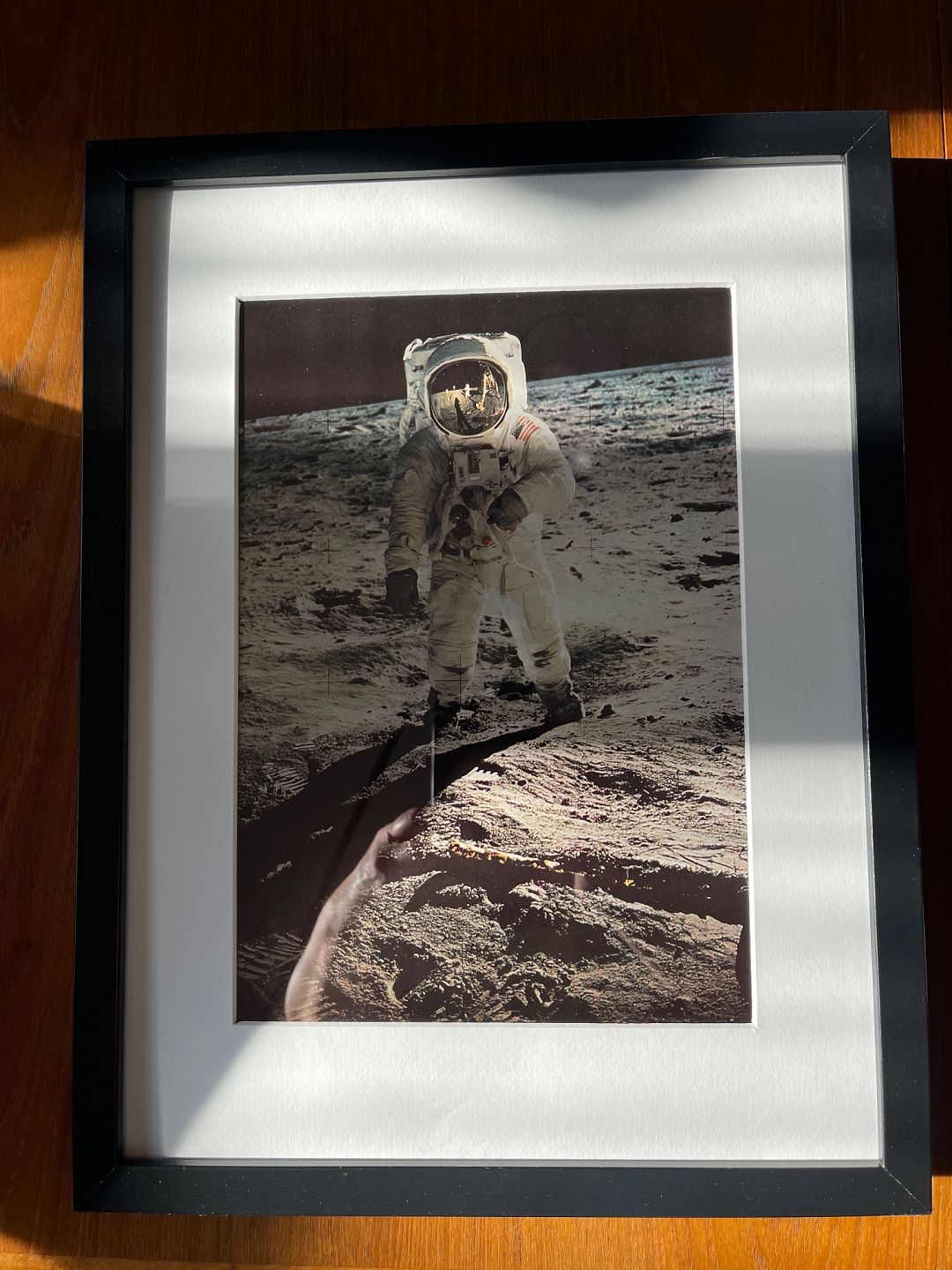Originalt NASA farveoffsetfotografi / fotoprint fra 1969 af Edwin "Buzz" Aldrin under Apollo-11 månemissionen, der satte de første mennesker på Månen. Aldrin ses på dette berømte foto i månelandskabet, mens fotografen Neil Armstrong spejles i Aldrins visir.