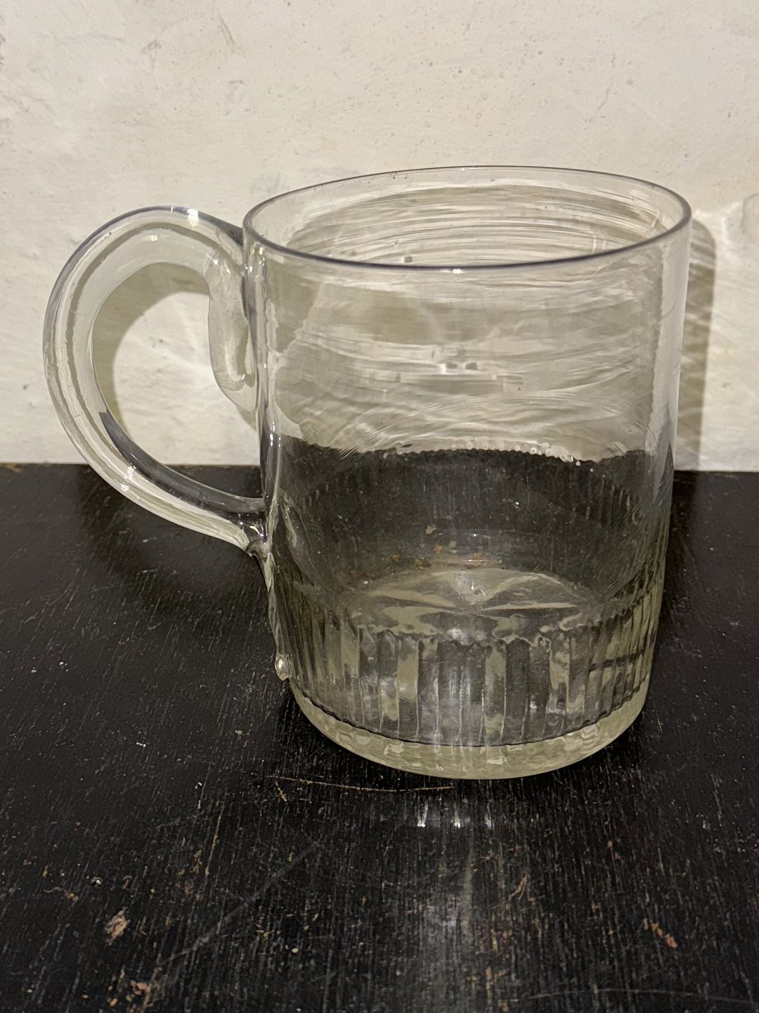 Stort ølkrus i glas. Riflet bundparti og påsat hank. Tilskrives Holmegaard Glasværk fra midten af 19. århundrede. I god stand uden skader eller reparationer. Mål: H. 13,5 cm. Ø. 11,5 cm