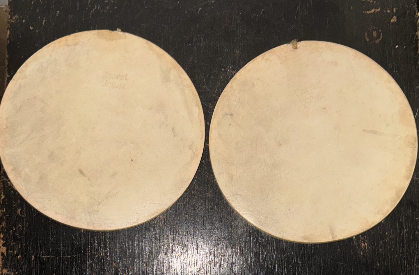 Pair of plates with motif of Bertel Thoevaldsen's “Night & Day” in relief. Made in plaster at the workshop of Hans Christian Brix (1831-1907) in the late 19th century. To emphasize the relief, the base is painted Burgundy. The plate appears in good condition with a few traces of use on the back, where the manufacturer's name is stamped - H. C. Brix. Diameter 18.3 cm