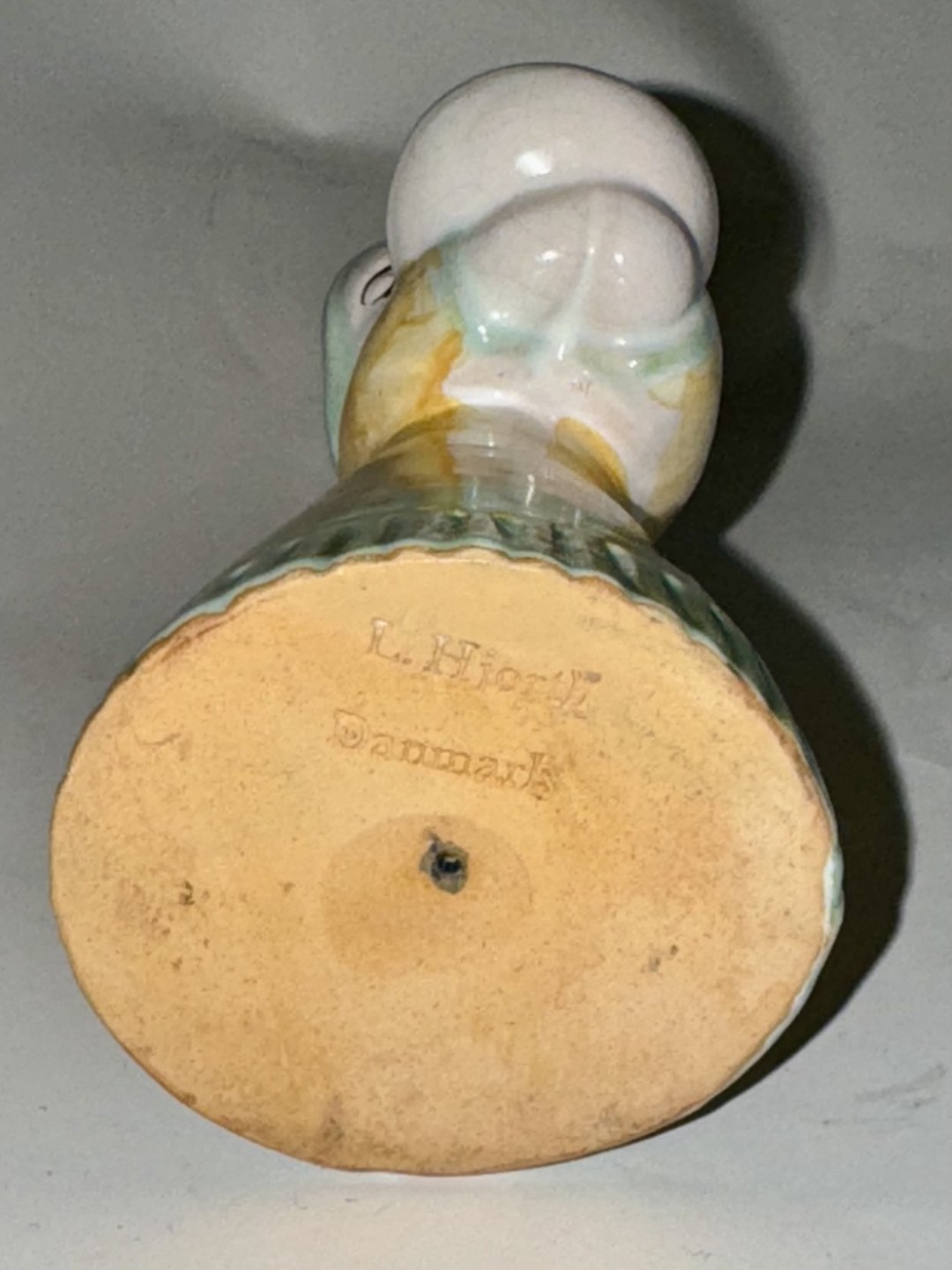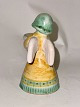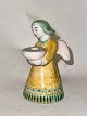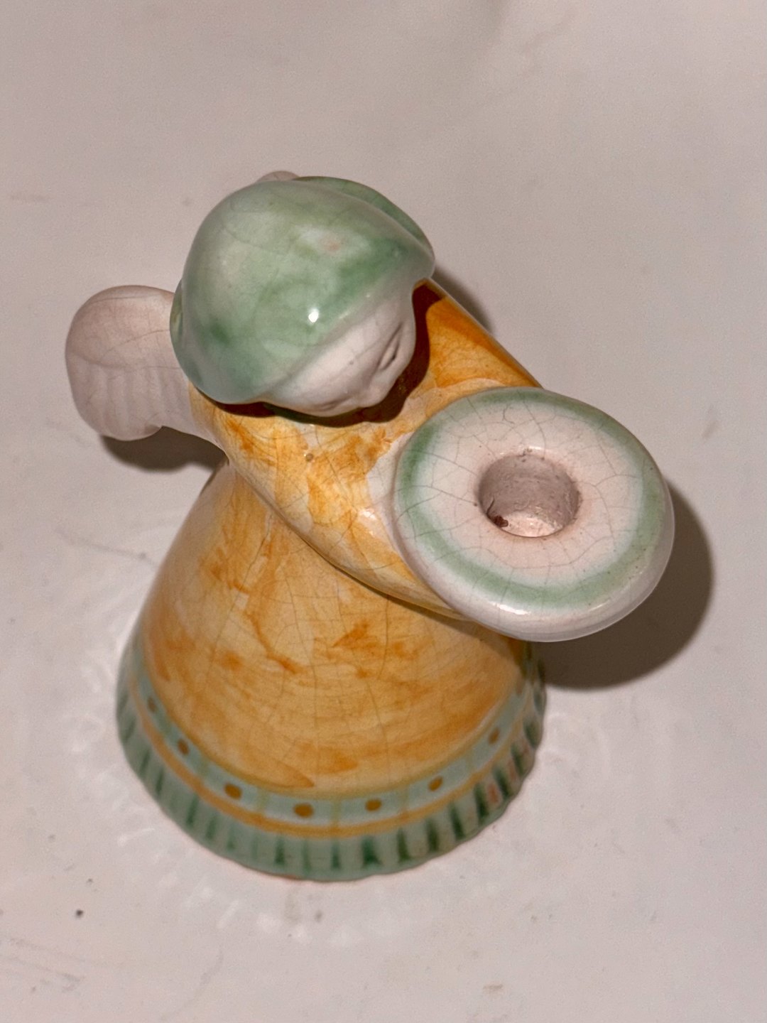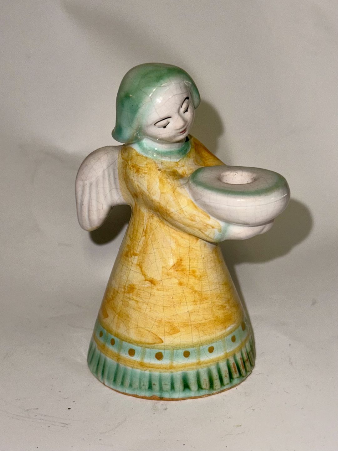 ANGEL IN A YELLOW DRESS: Figure of a painted angel in ceramic as a candle holder from the Bornholm pottery factory Lauritz Hjorth. The angel is wearing a yellow dress. In good condition. Factory mark on the bottom. H. 10 cm